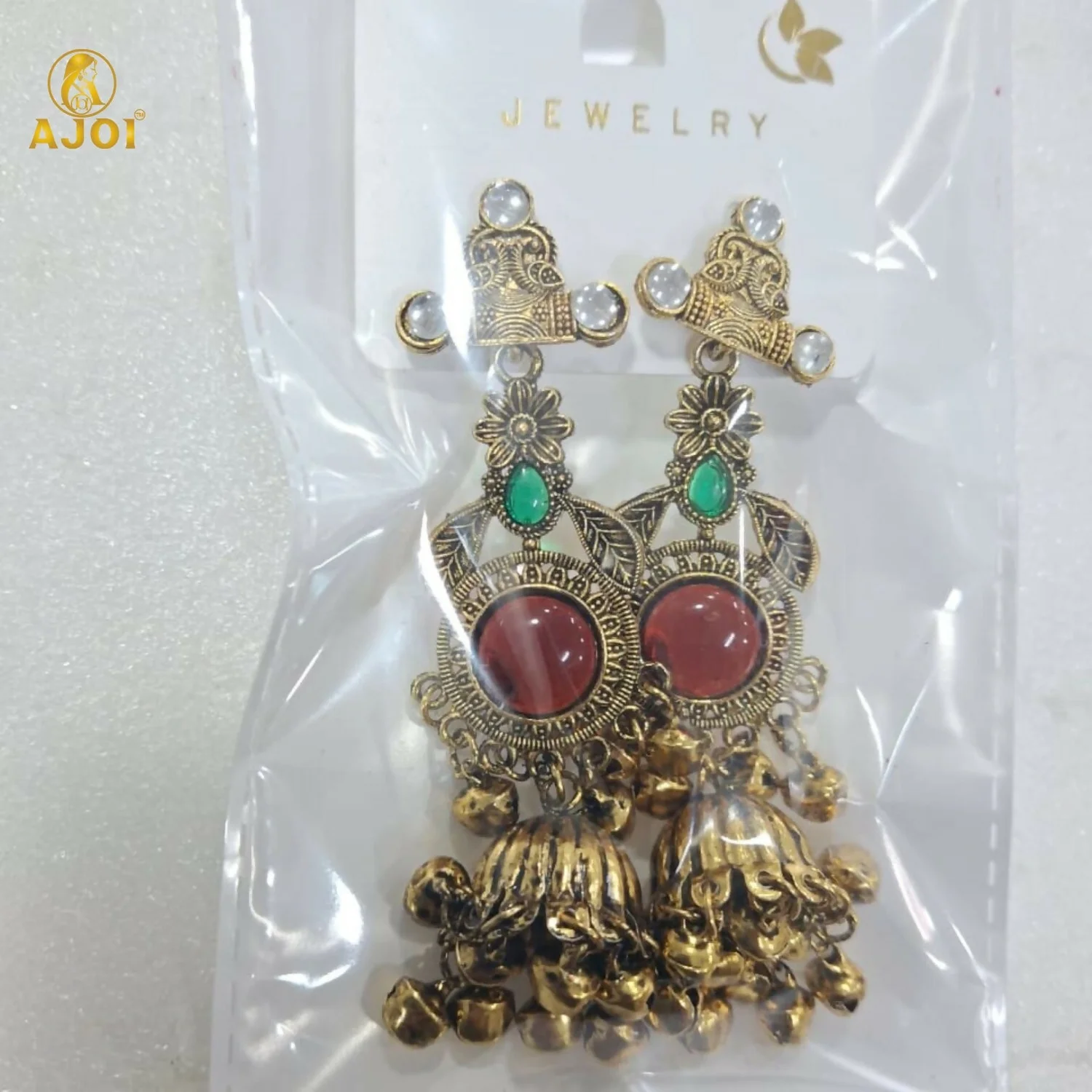 Enhance your ethnic elegance with these beautifully crafted antique gold plated long jhumka earrings. Designed with intricate traditional detailing, these earrings feature a rich red stone centerpiece highlighted by delicate green accents and sparkling stone studs at the top. The finely textured frame and floral elements add a vintage charm inspired by classic Indian jewellery.