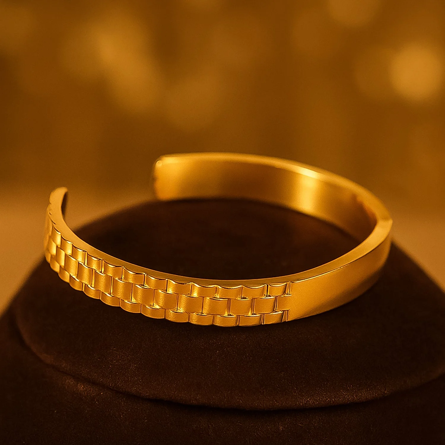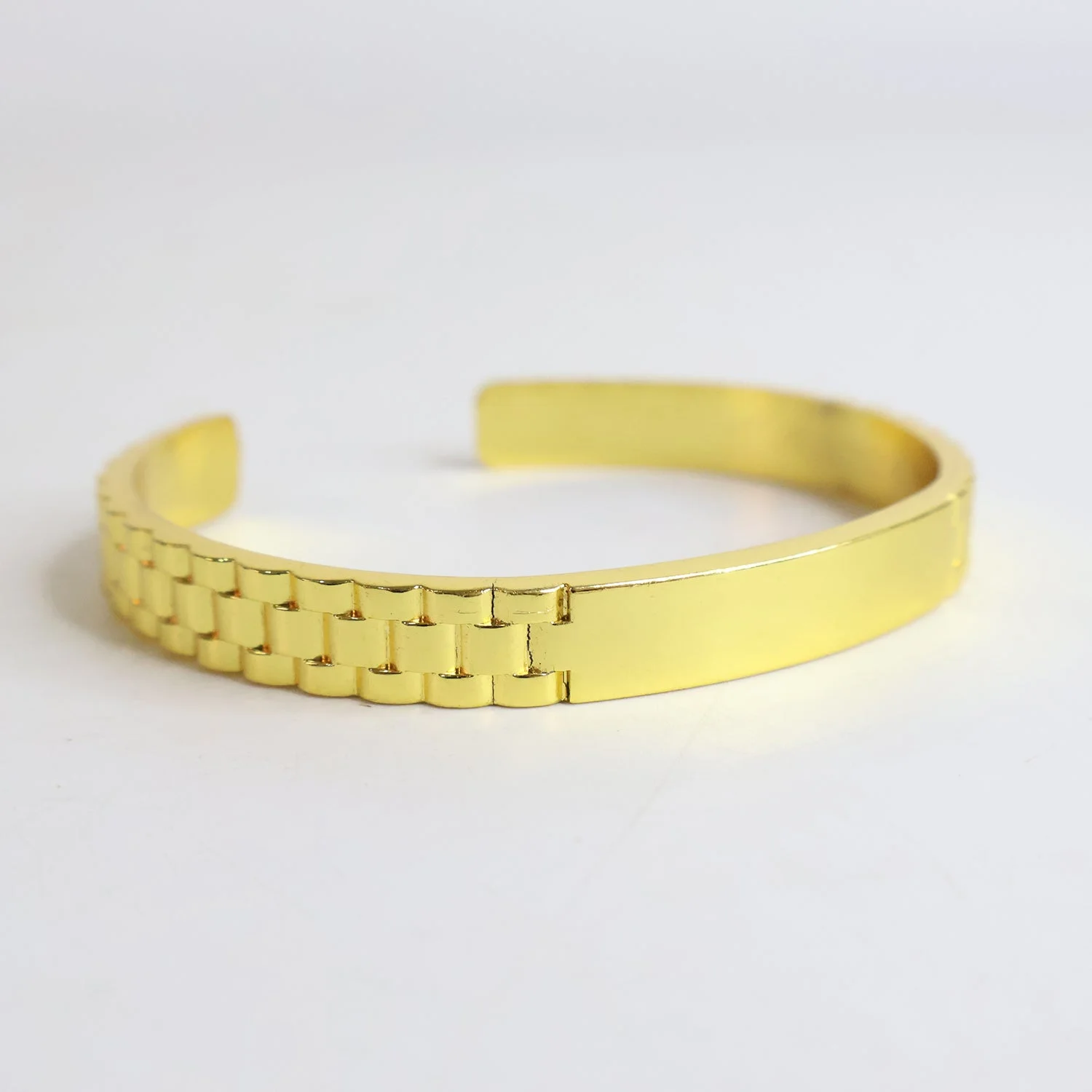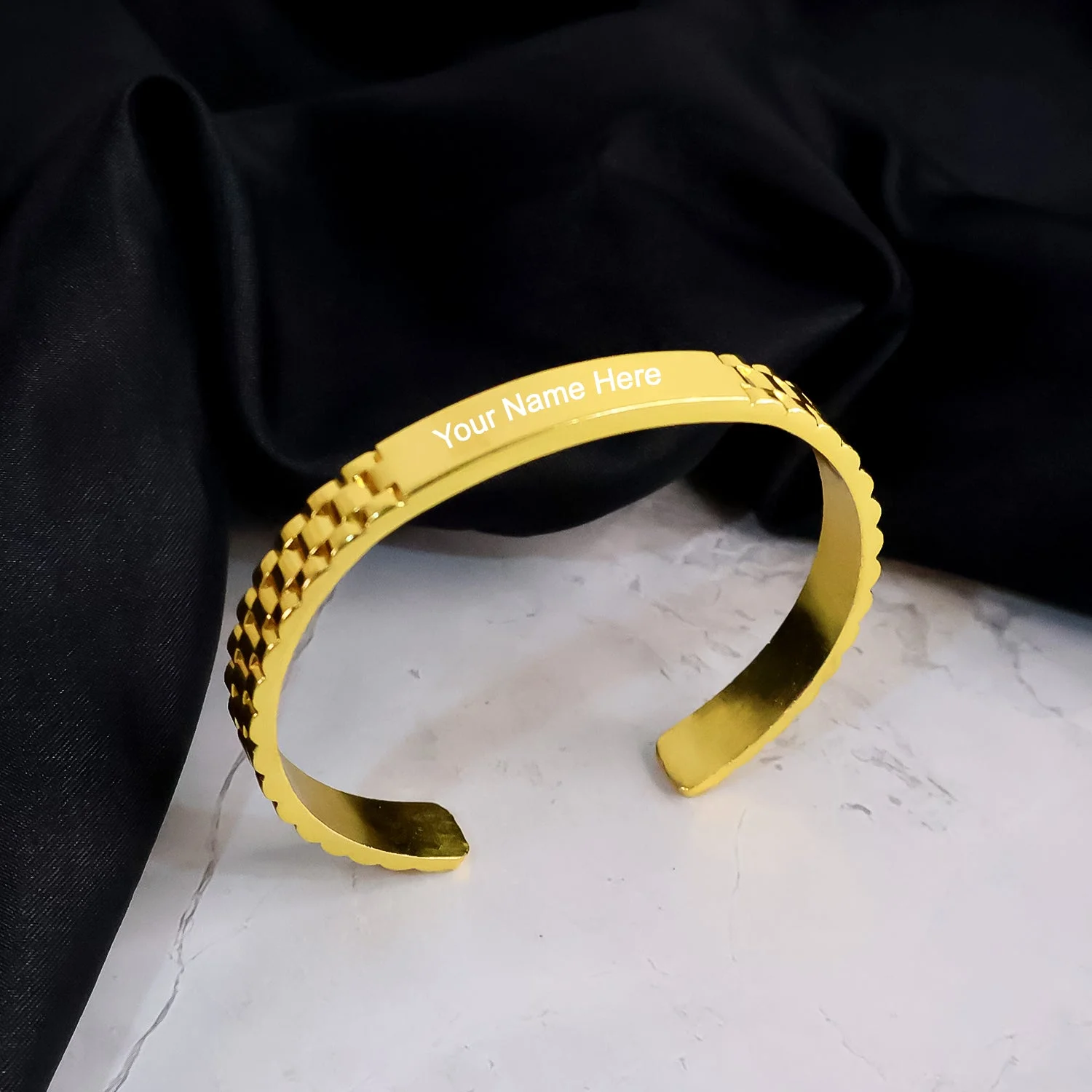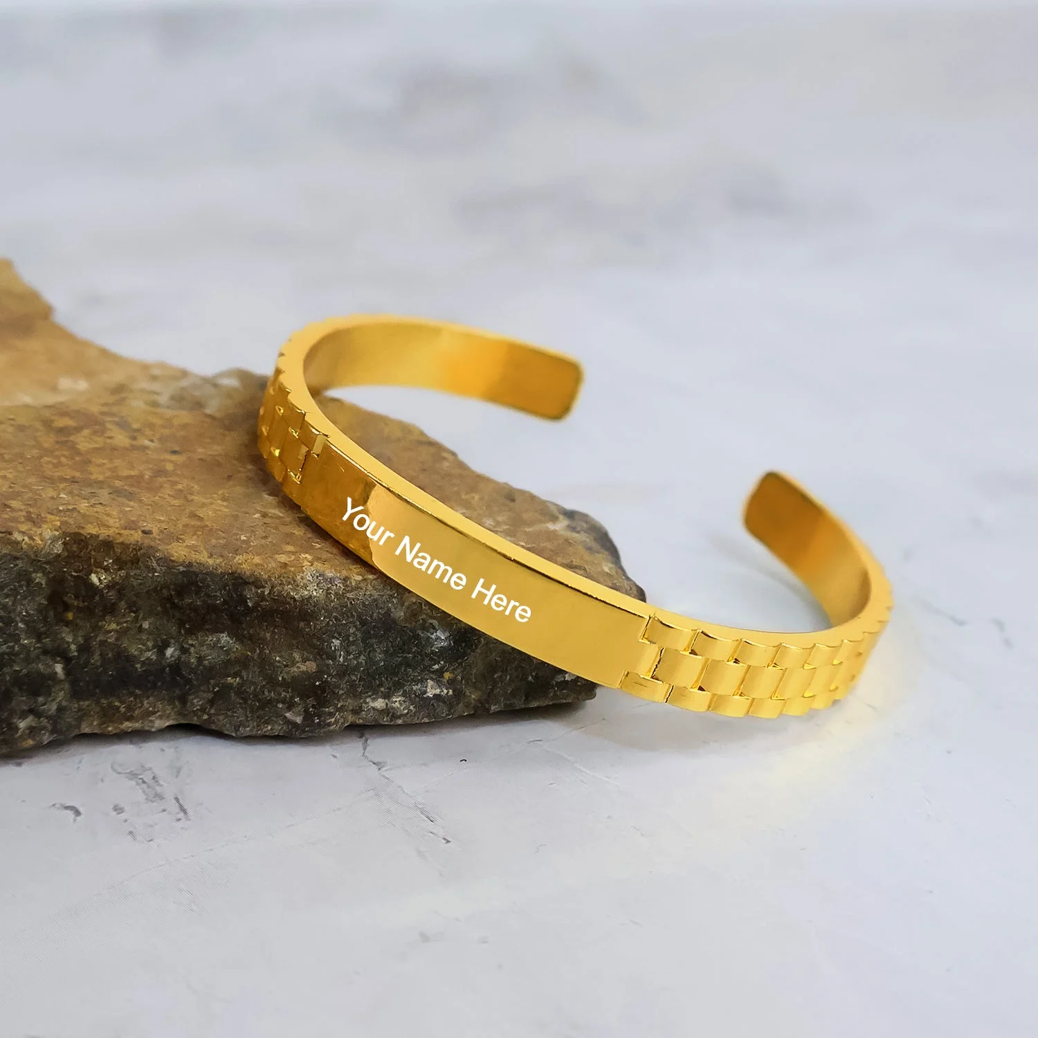 Add a personal touch to your style with this custom engraved gold-plated bracelet. Designed with a smooth engravable surface, it allows you to print your name, initials, or a meaningful message, making it a truly one-of-a-kind accessory. The elegant gold finish, combined with a comfortable cuff design and stylish side detailing, makes this bracelet perfect for everyday wear or as a memorable personalized gift.
