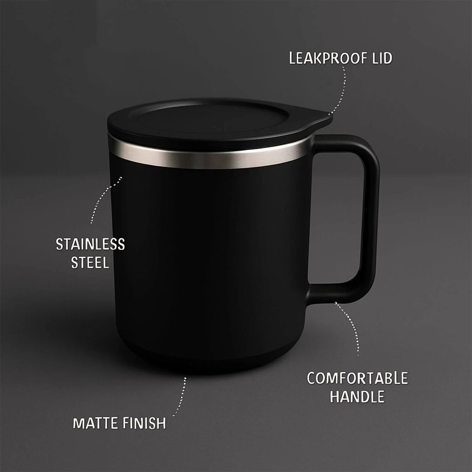 The Apex Happy Mug with 400 ml capacity is the perfect companion for your daily tea or coffee ritual. Designed with a sleek black matte finish and equipped with a soft silicone lid, this mug ensures both style and function. Its stainless steel inner lining offers excellent thermal insulation, keeping your beverage hot or cold longer. Ideal for busy professionals and comfort-seekers alike, this mug combines convenience, durability, and aesthetics in a single package.