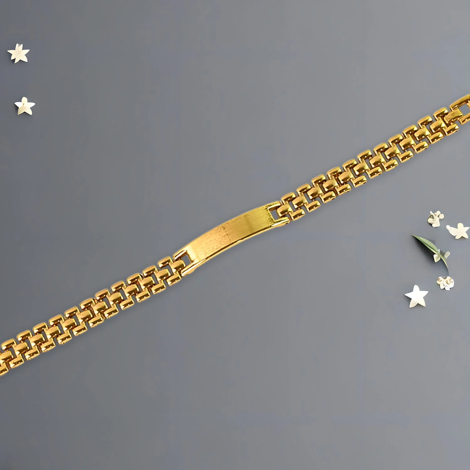 Celebrate Raksha Bandhan with grace and individuality through this stunning Customized Golden Bracelet , thoughtfully crafted for the modern man. Featuring a luxurious gold-tone chain and an engravable nameplate, this not only symbolizes sibling love but also doubles up as a timeless accessory. The central plate allows you to personalize the bracelet with your loved one’s name or a short message, making it an ideal keepsake gift. Designed using high-quality imitation metal with a brilliant gold finish, it is both elegant and durable—perfect for daily wear. This is more than a thread—it’s a bond made permanent.