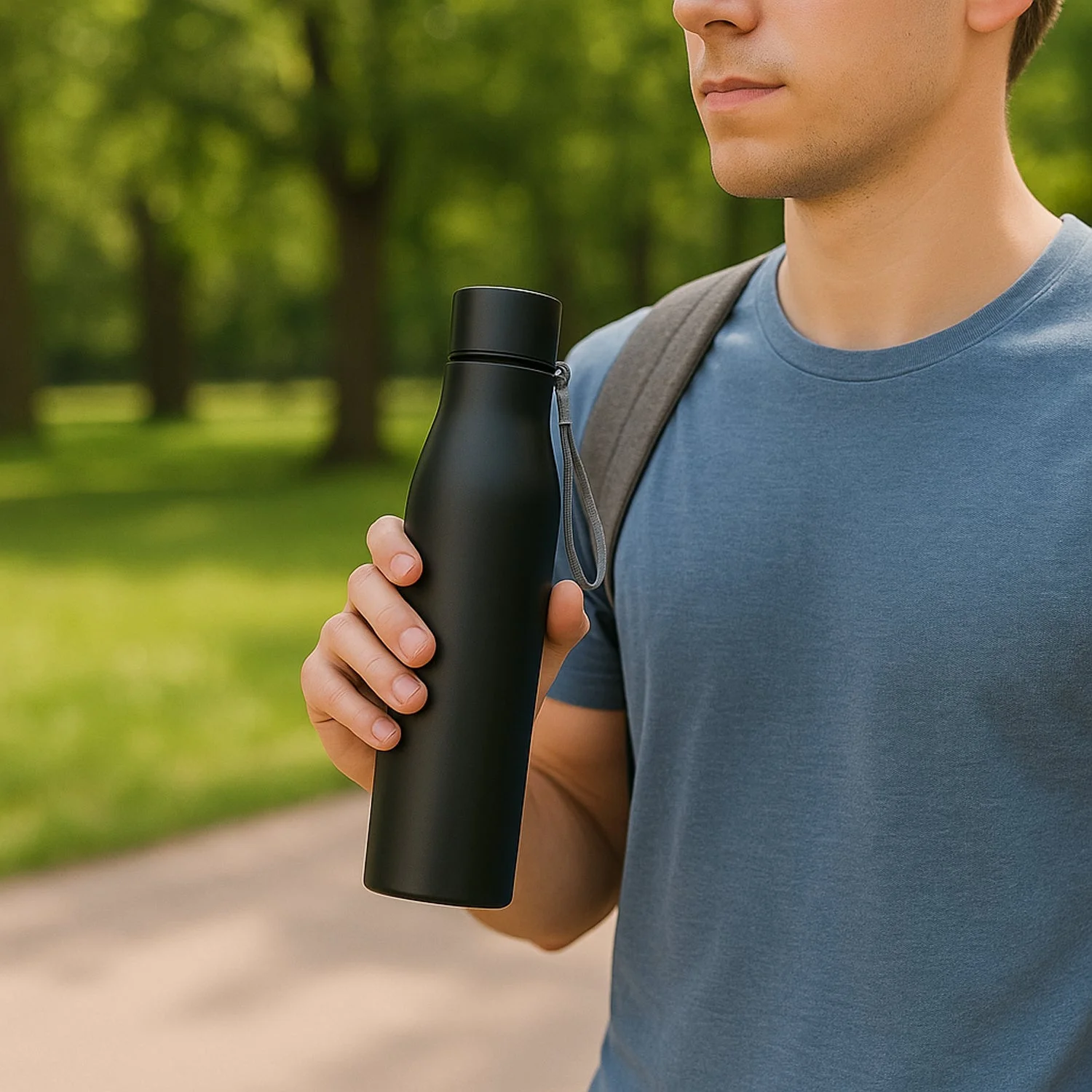 Its robust stainless steel body ensures temperature resistance and longevity, while the screw-on cap prevents leaks during travel. Lightweight and equipped with a strong wrist strap, this bottle is perfect for people on the go.