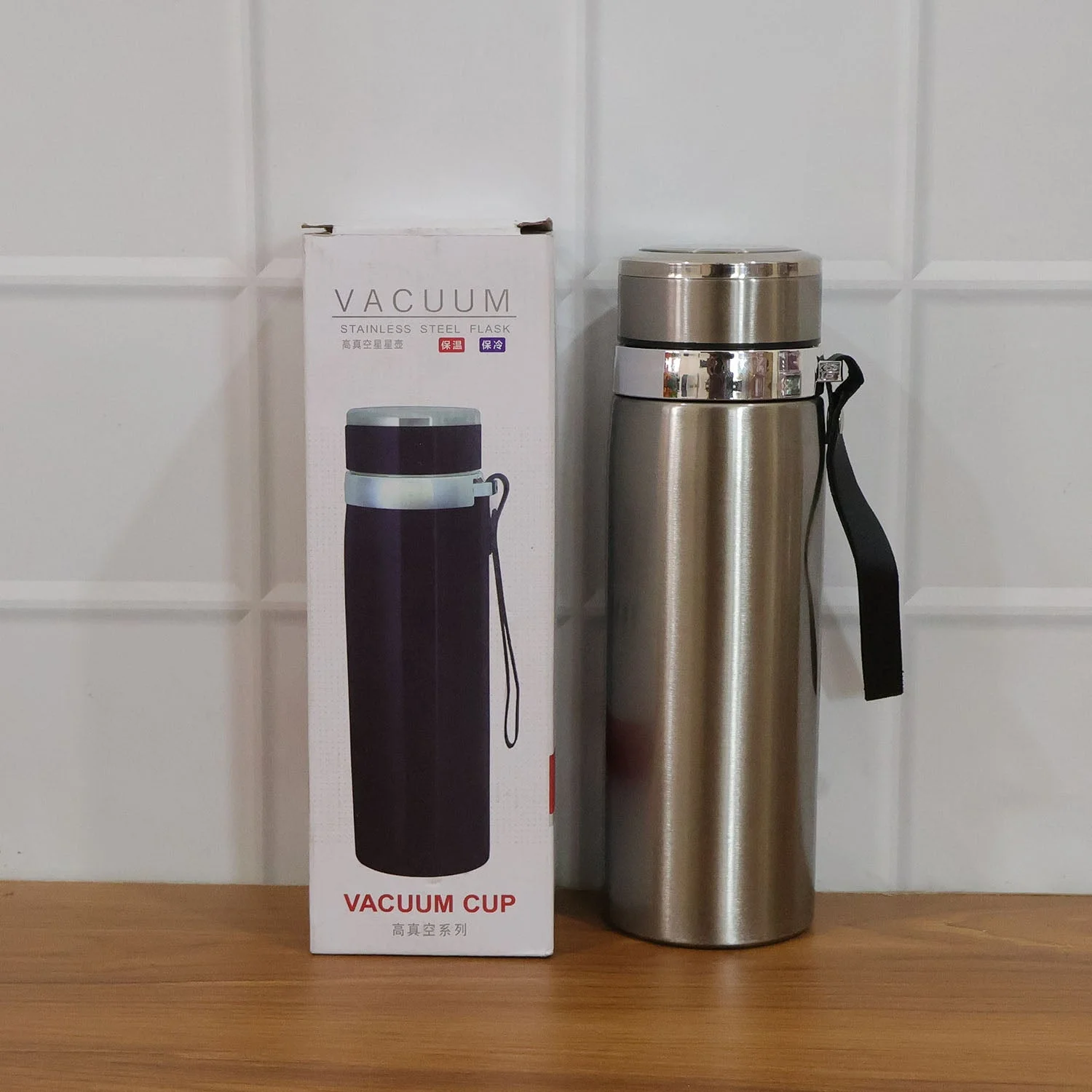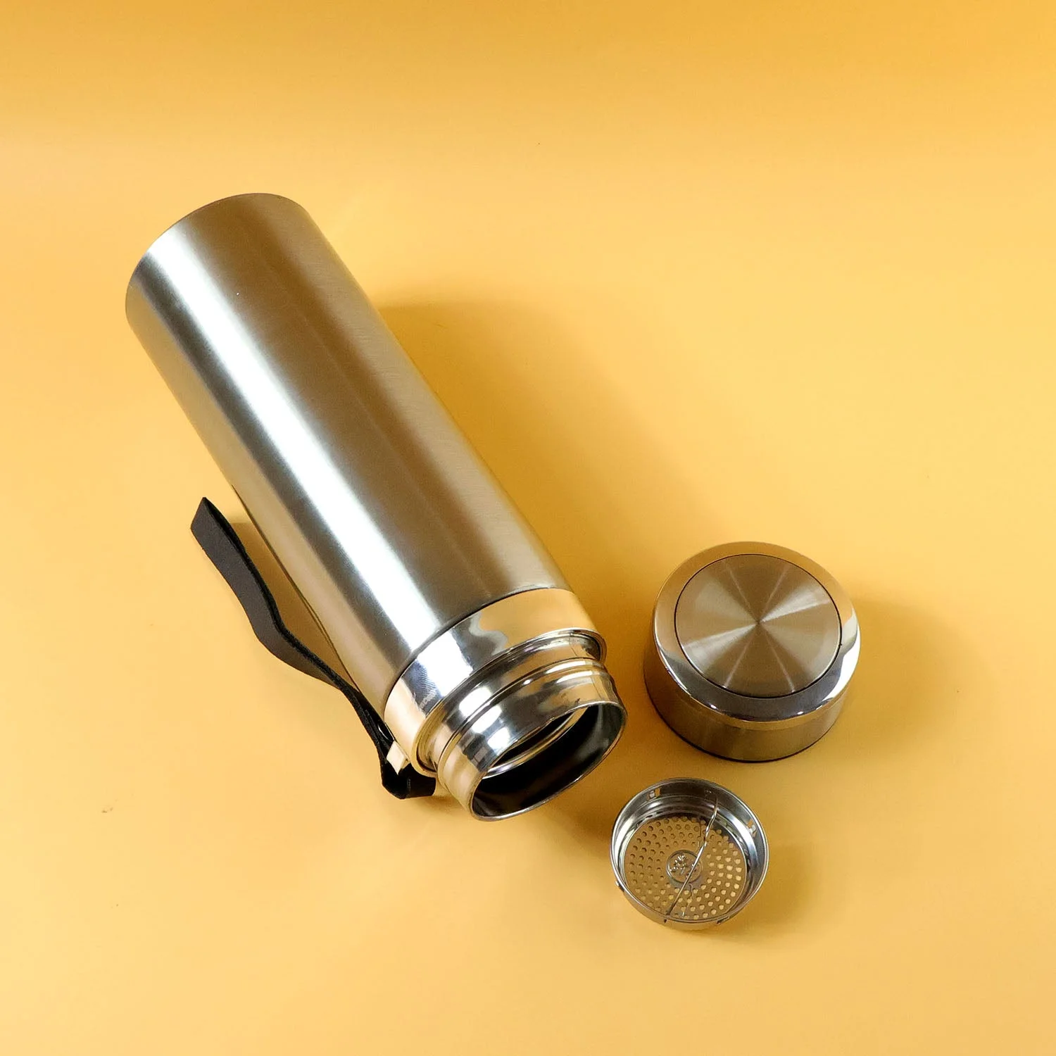 Stay refreshed throughout the day with this 800 ML stainless steel vacuum insulated flask bottle designed to maintain beverage temperature for longer durations. Crafted with a double wall insulated body, this flask helps keep drinks hot or cold while preventing external condensation. The leakproof lid ensures secure closure, making it safe to carry in bags during travel, office or outdoor activities. Its sleek metallic finish gives it a modern and professional look, while the attached strap offers convenient portability. Ideal for daily hydration needs, this vacuum flask is suitable for water, tea, coffee and other beverages.