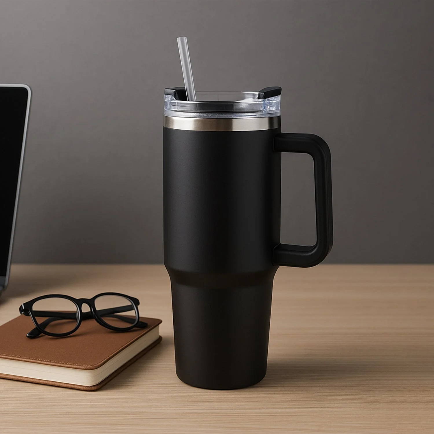 insulated mug, thermal mug, travel mug, hot and cold beverage mug, drinkware, straw mug,office drinkware,desk mug with straw,large handle mug, car cup holder mug, matte black mug