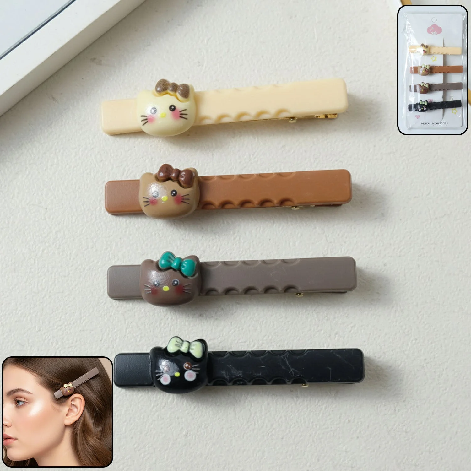 Cute Cartoon Cat Design Hair Clips Set for Girls and Women – Decorative Snap Hair Pins for Daily Styling and Party Wear – 4 Pc Hair Accessories Combo