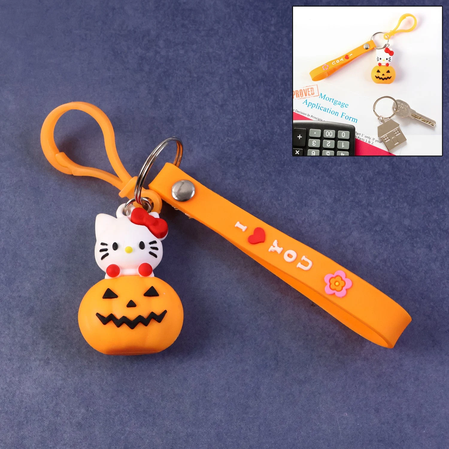 cute cartoon cat keychain, pumpkin theme silicone keychain, silicone keychain with strap hook, decorative key ring for bags, flexible loop keychain, keychain for keys and purses, cute novelty keyring, halloween cat keychain charm, silicone bag charm keyring, daily use keychain accessory, fun cartoon keychain, portable keyring with strap, cute animal keychain for kids