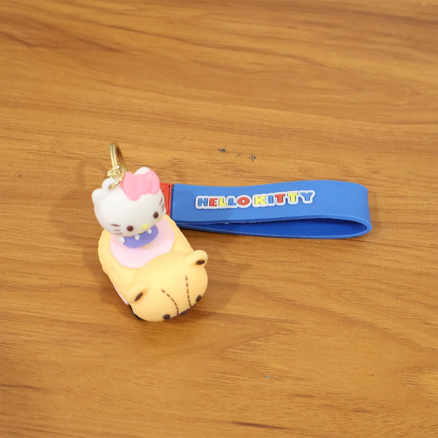 cute cartoon cat keychain, cat riding toy car keychain, silicone keychain with wrist strap, decorative key holder, metal ring keychain, hanging keychain for bags, keychain for keys, novelty cat keyring, fun silicone keychain, kids accessory keychain, daily use keychain, backpack hanging charm, purse keychain accessory, portable cat toy keychain