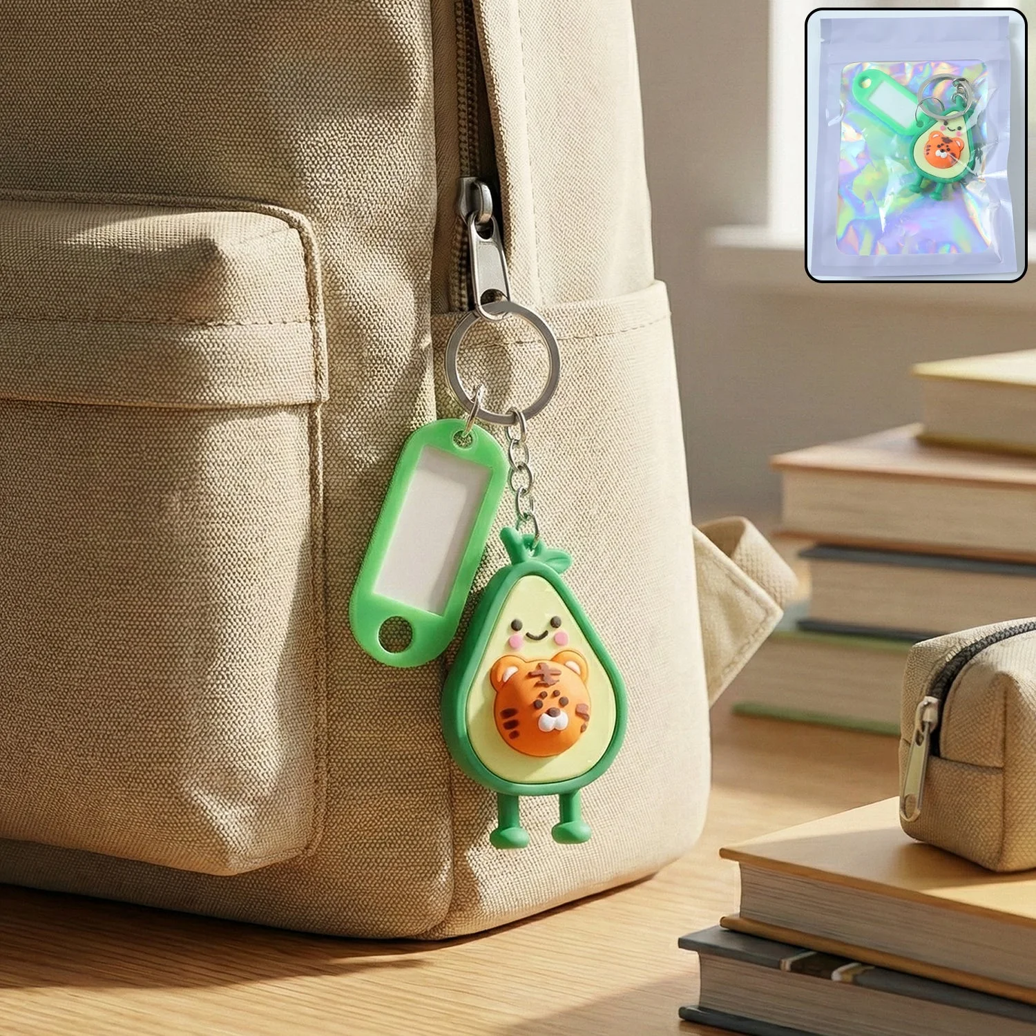 cartoon character keychain, decorative keychain, keychain with ID tag, name tag keychain, metal ring keychain, backpack keychain, school bag keychain, cute keychain, daily carry accessory, luggage tag keychain, personalized keychain, fun character keychain, bag charm keychain