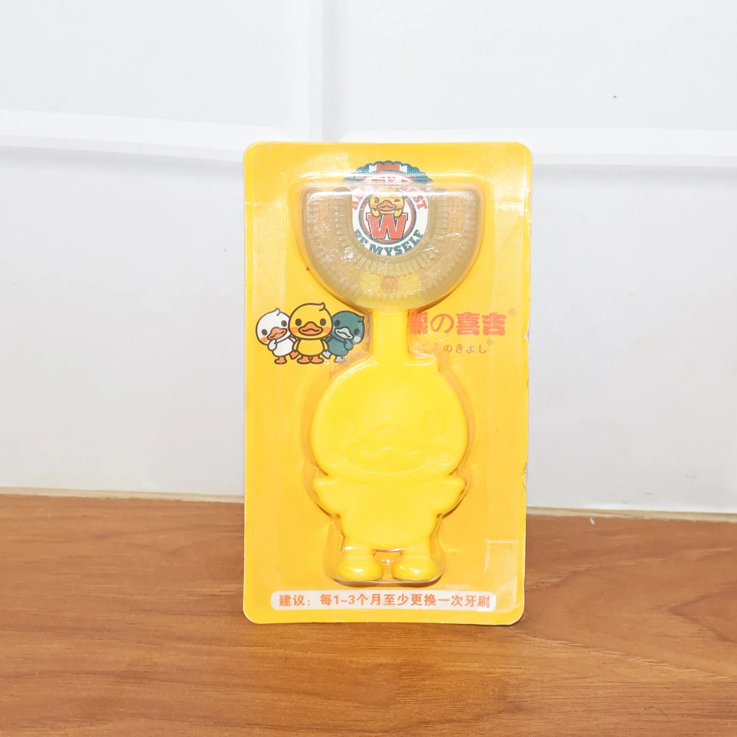 Cute duck cartoon handle makes brushing fun for kids.