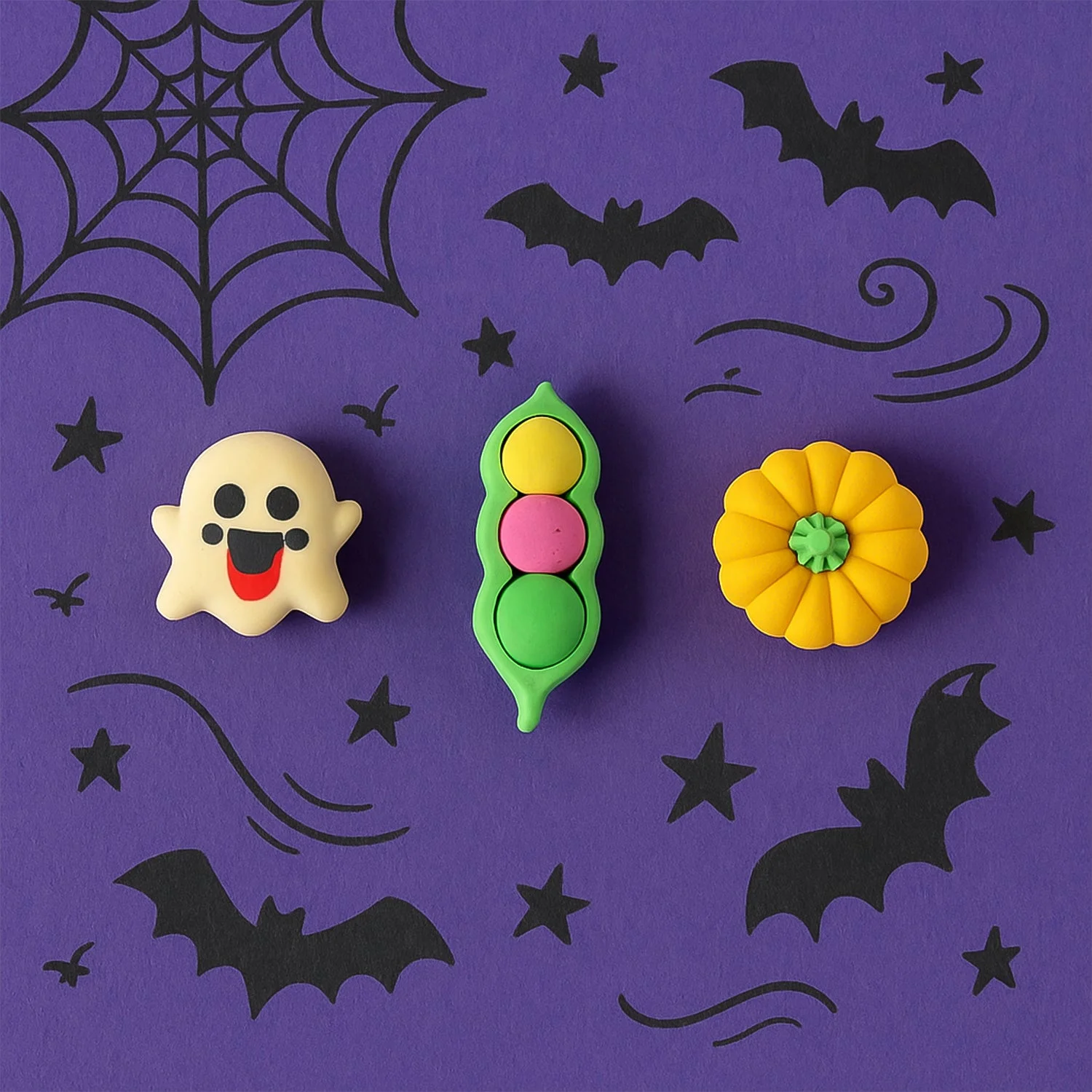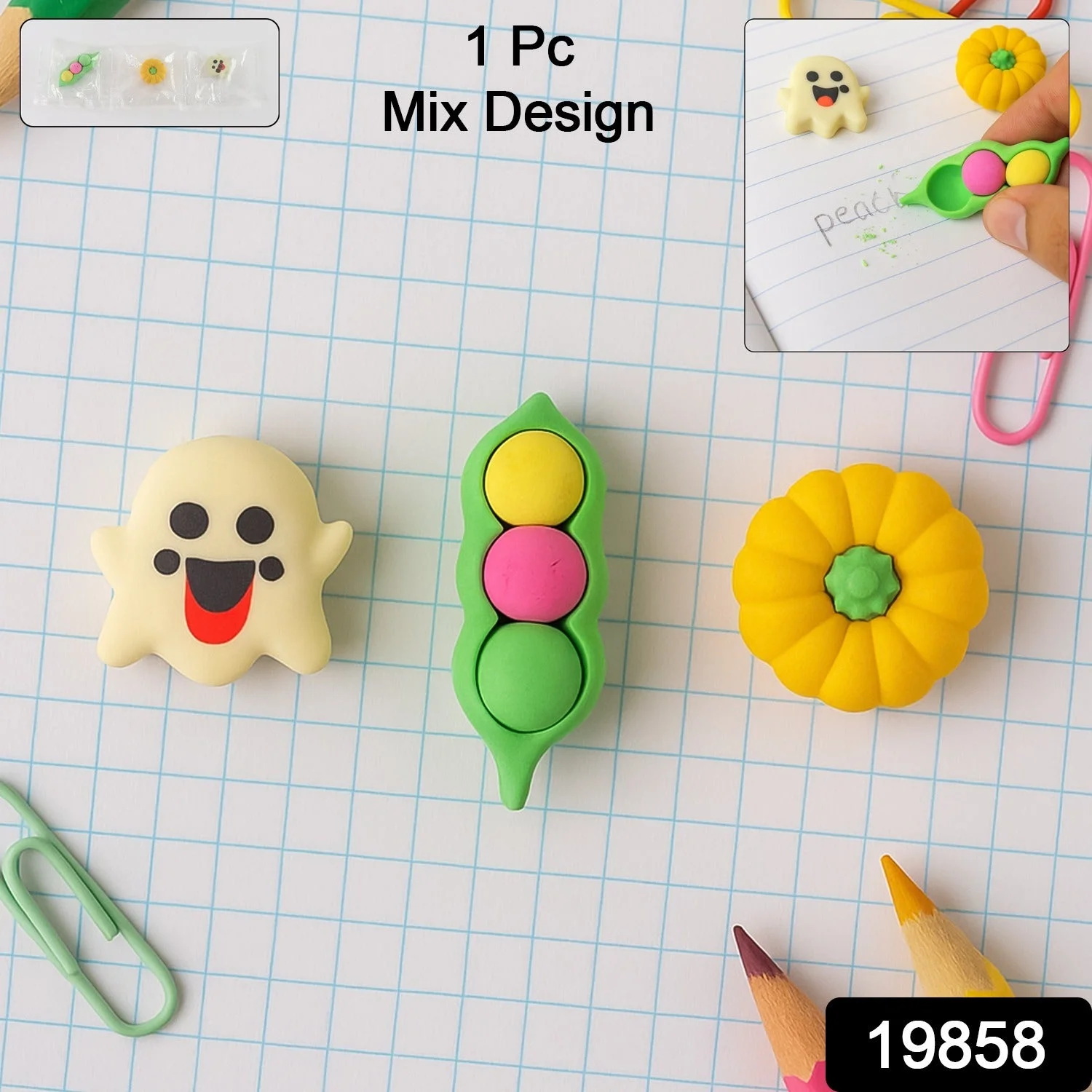 Cute Cartoon Eraser – Soft Non-Toxic TPR Rubber, Fun 3D Shapes (Ghost/Pea Pod/Pumpkin) | Clean Erasing for School & Office, Collectible Desk Toy | 1 Pc, Mixed Design