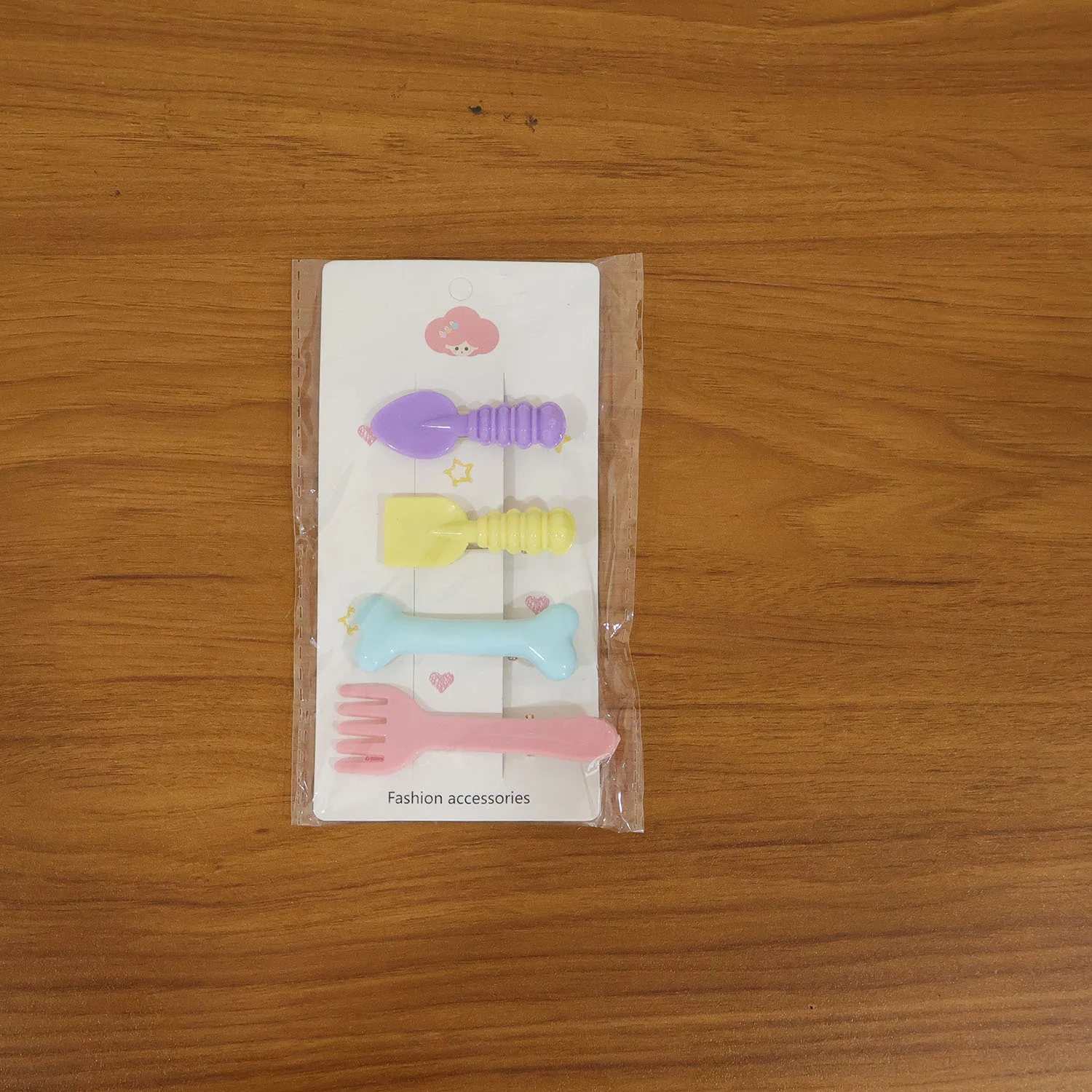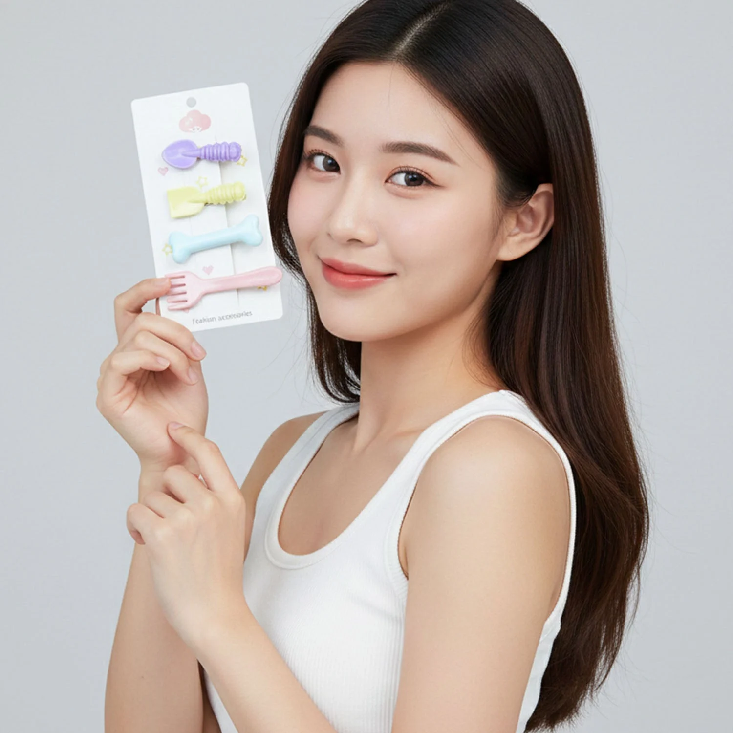 Add a playful and adorable touch to everyday hairstyles with this 4-piece cartoon food shape hair clip set. Designed in cute spoon, fork, bone, and candy-inspired shapes, these colorful hair pins bring a fun and trendy vibe to kids’ styling. The smooth finish and lightweight structure make them comfortable for all-day wear without pulling hair. Each clip features a sturdy metal clasp that provides a firm grip, keeping hair neatly in place. Perfect for casual outings, school days, birthday parties, and festive occasions, this stylish set enhances any look with a charming and creative appeal.