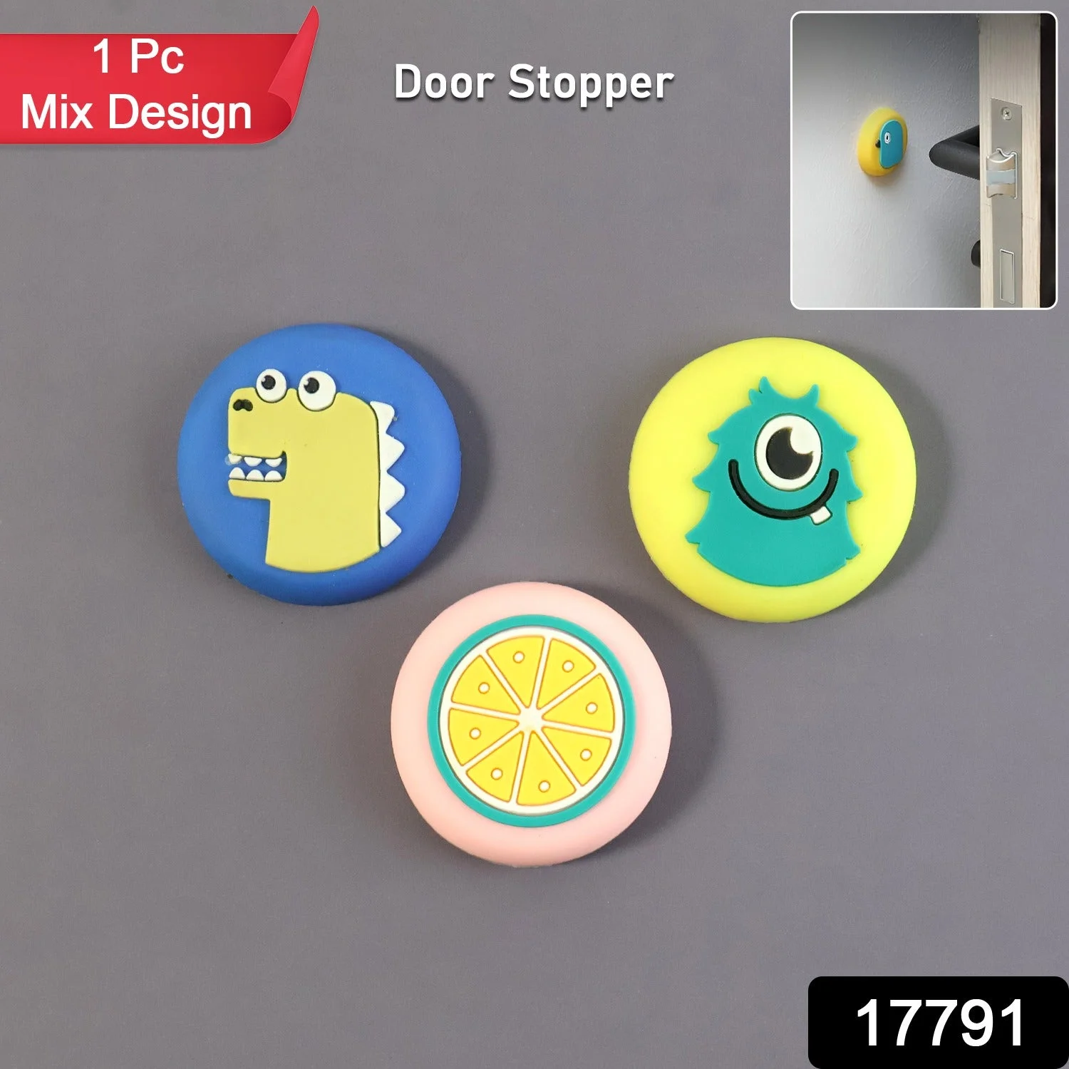 This fun and functional wall door stopper bumper is designed to protect your walls from damage caused by door handles and knobs. Featuring playful cartoon and fruit-inspired designs, it adds a touch of charm to any space while quietly absorbing impact every time the door opens. The strong self-adhesive backing makes installation quick and hassle-free—simply peel and stick on the wall at the height of the door handle. Its soft, cushioned surface helps reduce noise, prevents dents, marks and scratches, and keeps your walls looking clean and fresh. Compact and versatile, this door guard is perfect for homes with children, rental apartments, offices and hostels. Each piece comes in an assorted design, making it a delightful and practical addition to your everyday home essentials.