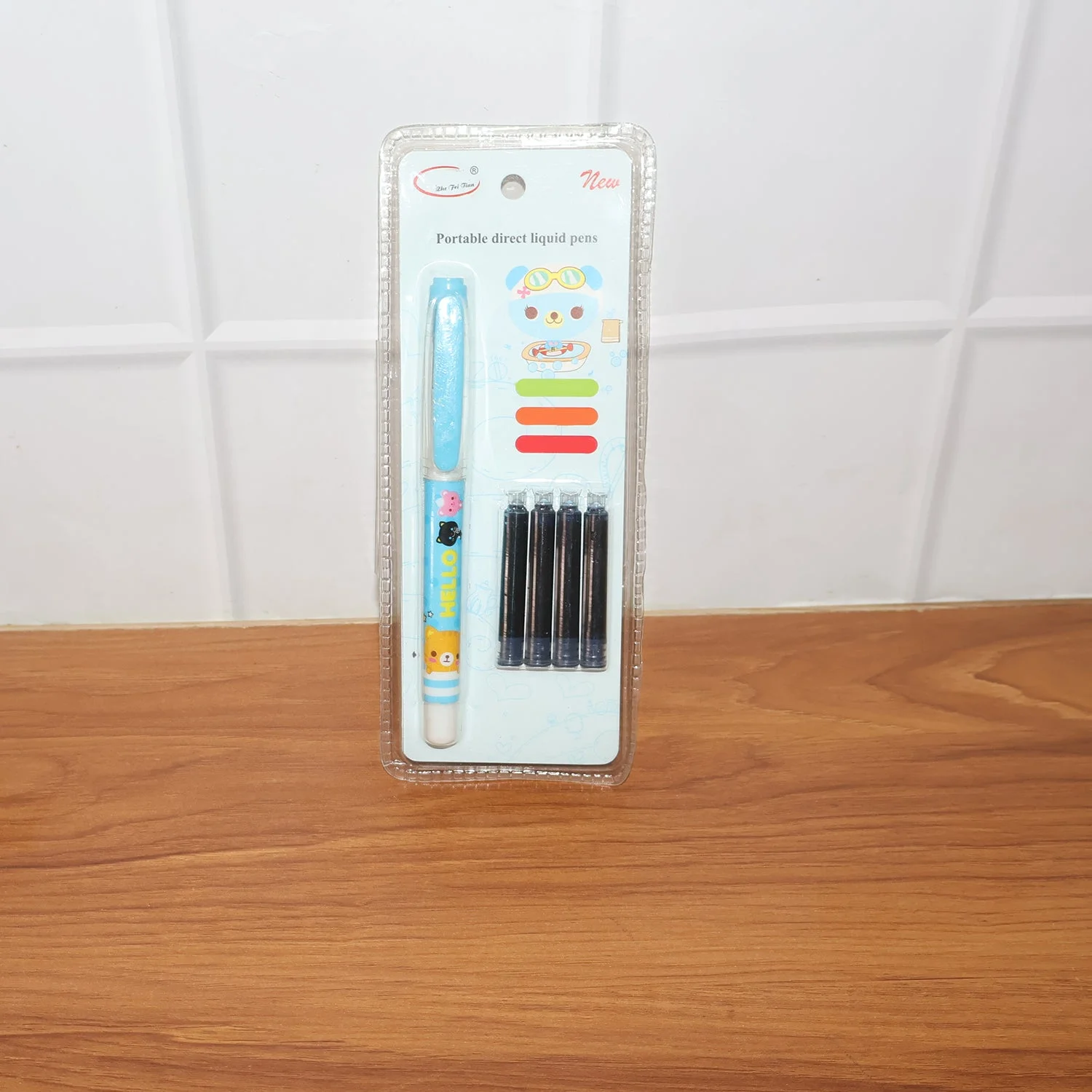 This cartoon-designed liquid ink pen set is a fun and practical writing solution for everyday use. Designed with a smooth fountain-style nib, it delivers consistent ink flow for neat, elegant handwriting. The pen comes with multiple refillable ink cartridges, making it economical and convenient for long-term use. Its lightweight body and comfortable grip ensure fatigue-free writing during extended study or work sessions. The attractive cartoon design adds a playful touch, making it especially appealing for students while remaining functional for regular writing tasks.