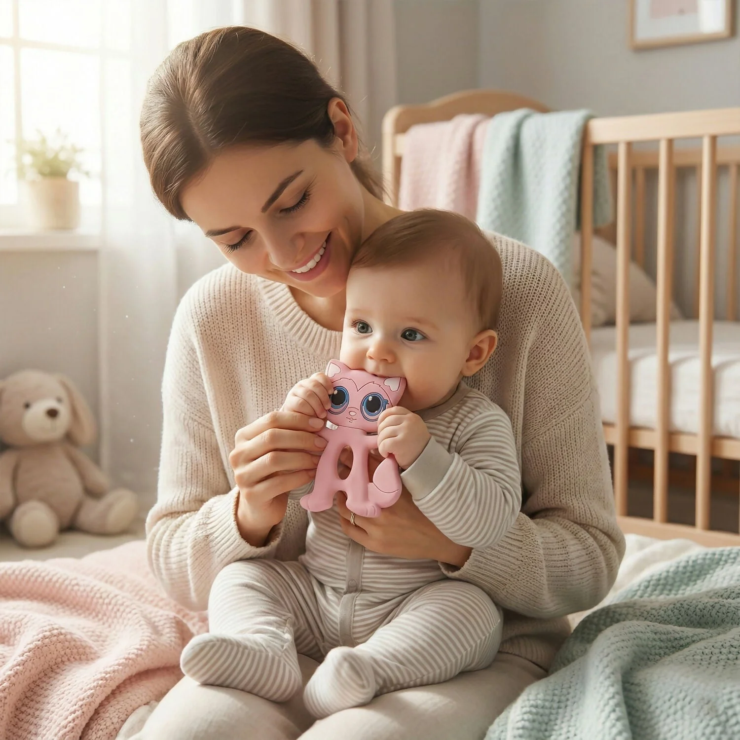 This cute cat baby teether is designed to gently soothe tender gums with its soft chewable surface and easy-to-hold shape. The lightweight design makes it simple for infants to grip, encouraging sensory development and self-soothing. It offers multiple textures that help relieve discomfort during teething while keeping babies engaged. Safe for everyday use, it supports early motor skills and provides comfort during fussy moments. A perfect teething companion for little ones.