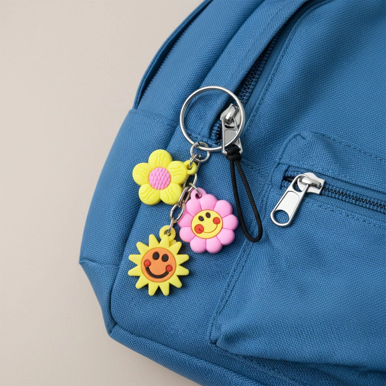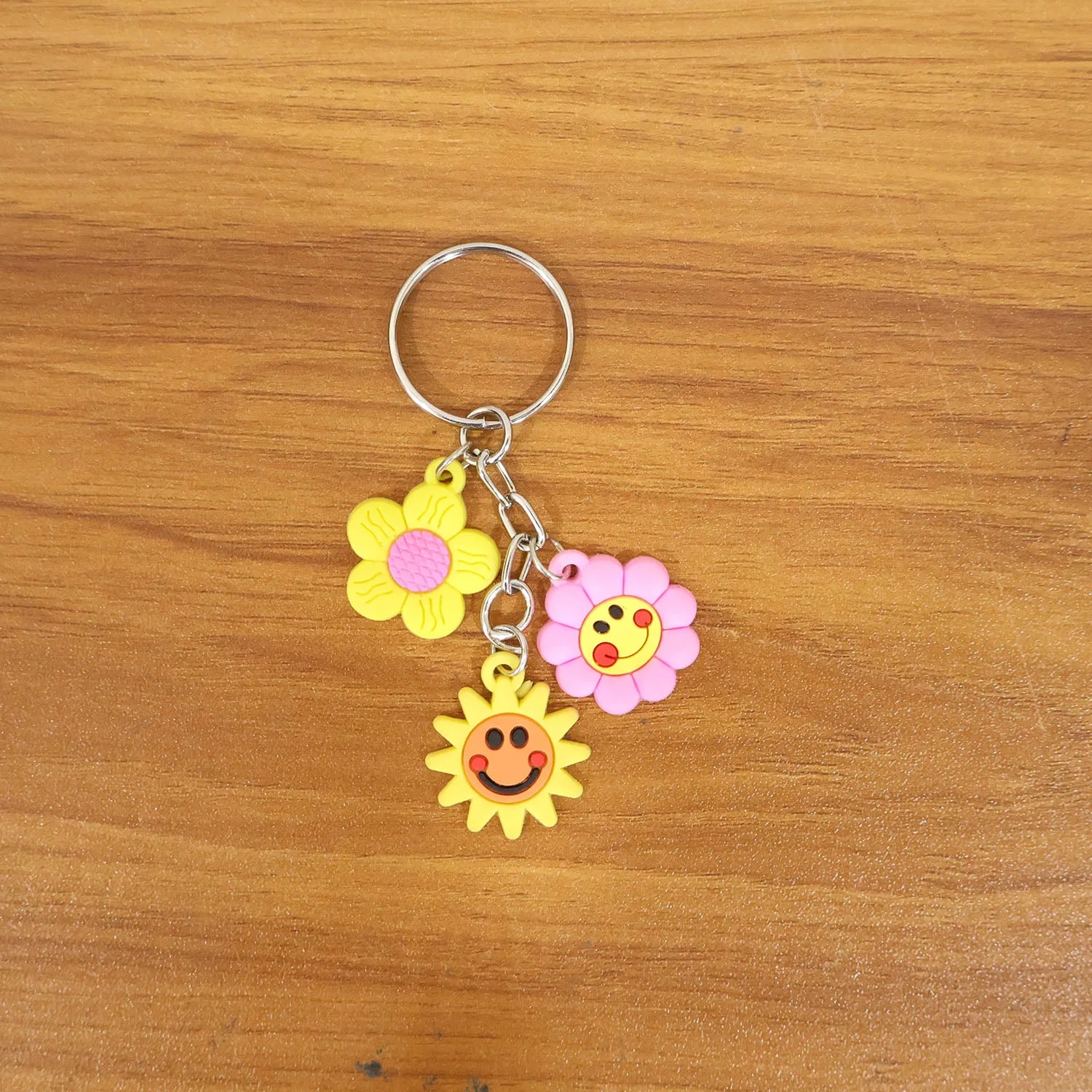 Bring cheerful vibes to your daily essentials with this adorable flower and smiley face cartoon keychain. Designed with three cute dangling charms featuring bright flowers and a smiling sun face, this keychain instantly adds personality and color to keys, bags, and backpacks. The compact yet eye-catching design makes it easy to carry without adding bulk, while the sturdy metal ring ensures keys stay securely attached. Ideal for everyday use, this decorative keychain doubles as a stylish accessory and a fun gift option for all age groups.
