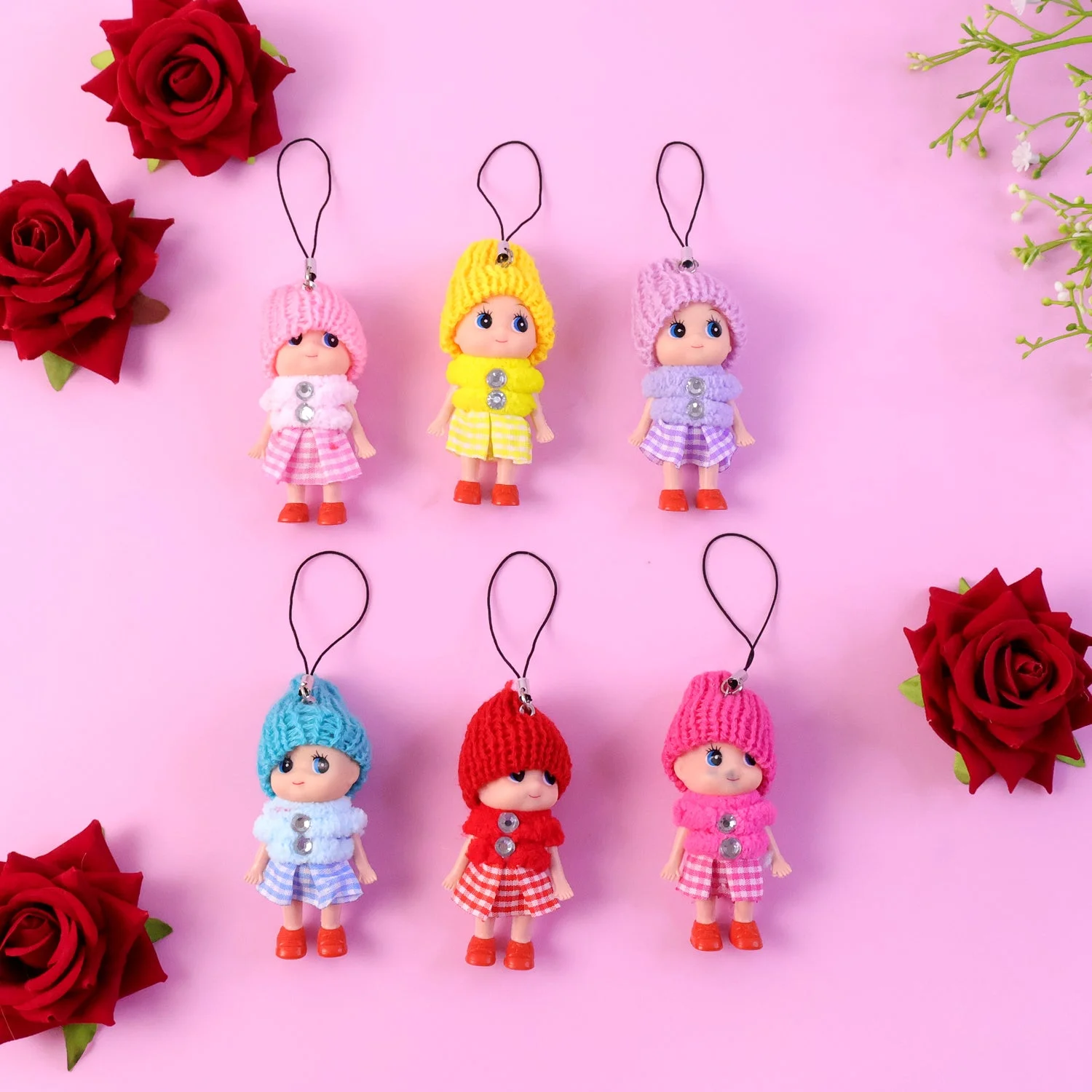 cute mini doll keychain, hanging keychain set, 6 pc doll charms, soft cap cartoon dolls, keychain for girls, school bag charms, handbag keychains, decorative keychain set, gift decoration charms, return gift keychains, mini doll bag charm, cartoon character keychain, kids bag accessories, cute bag charms, fun keyring set, girls cartoon doll keychains, party favor keychains