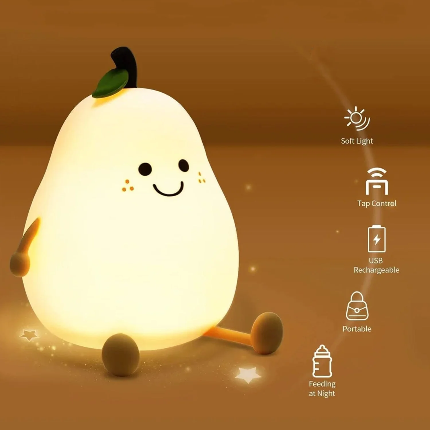 Brighten up your space with this adorable pear-shaped silicone night lamp designed to create a warm and comforting atmosphere. Made with a soft-touch silicone exterior, this lamp emits a gentle LED glow that is easy on the eyes and perfect for nighttime use. The cute smiling face and playful design make it an attractive addition to kids’ rooms, bedside tables and study desks. With simple touch control functionality, you can easily switch between light modes and enjoy soothing illumination. Its compact and portable design makes it convenient to place anywhere in your home.