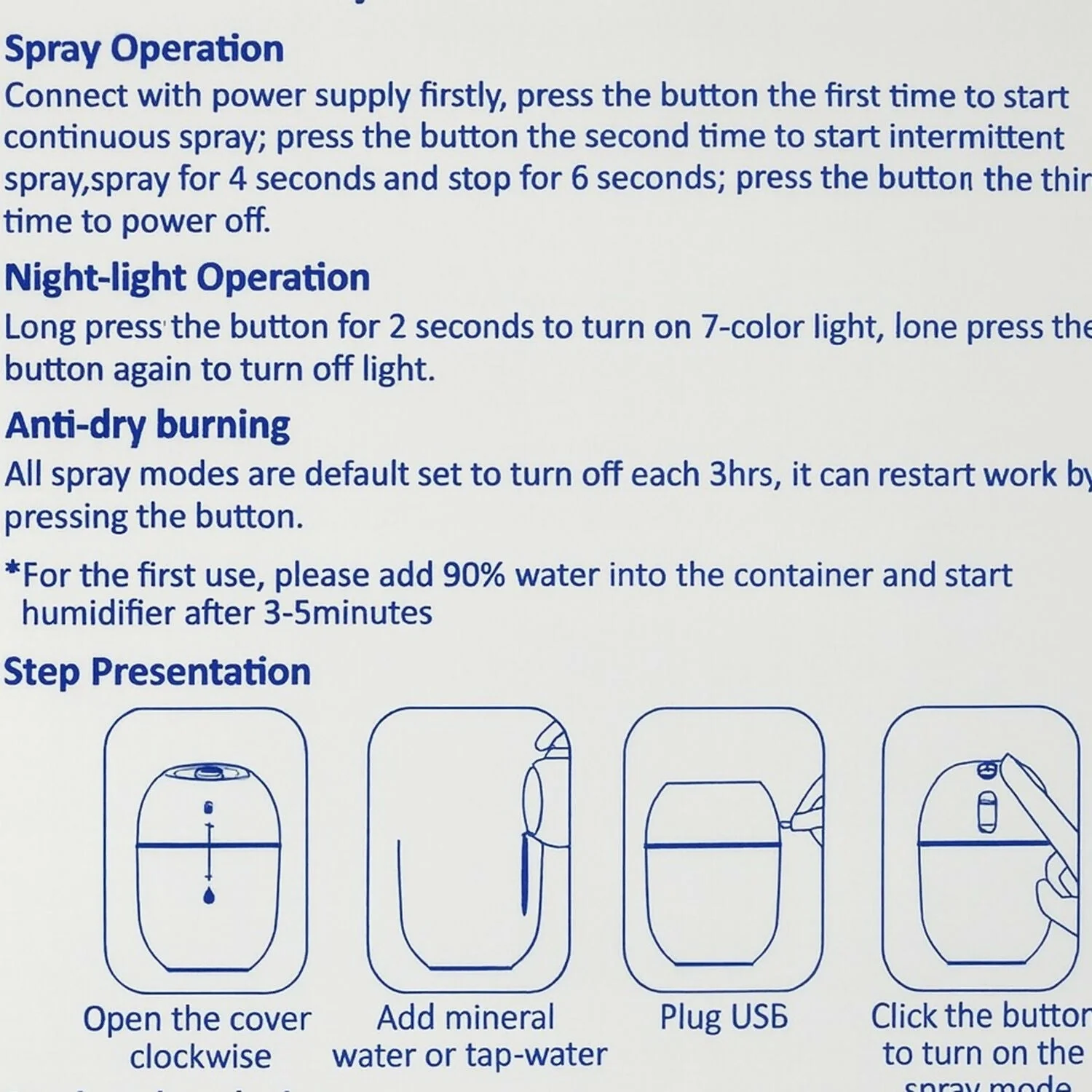 Open the lid, add water, plug USB, and press once to start misting.