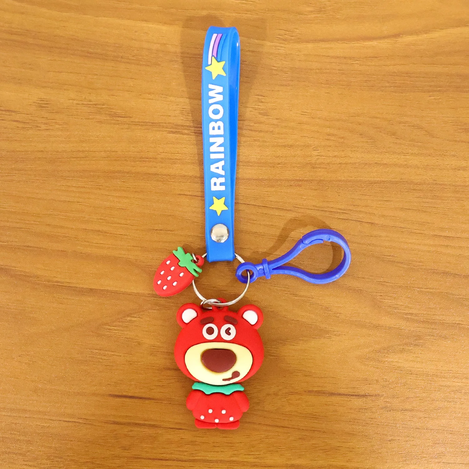 Add a touch of fun and color to your daily essentials with this adorable teddy bear keychain featuring a vibrant rainbow wrist strap and cute strawberry charm. Designed with a soft cartoon-style character, this key ring makes a charming accessory for school bags, handbags, pencil pouches and keys. The sturdy strap ensures a comfortable grip and easy carrying, while the secure key ring keeps your keys safely attached. Its playful design makes it a favorite among kids and teenagers. Perfect for gifting or personal use, this keychain adds personality to everyday items.