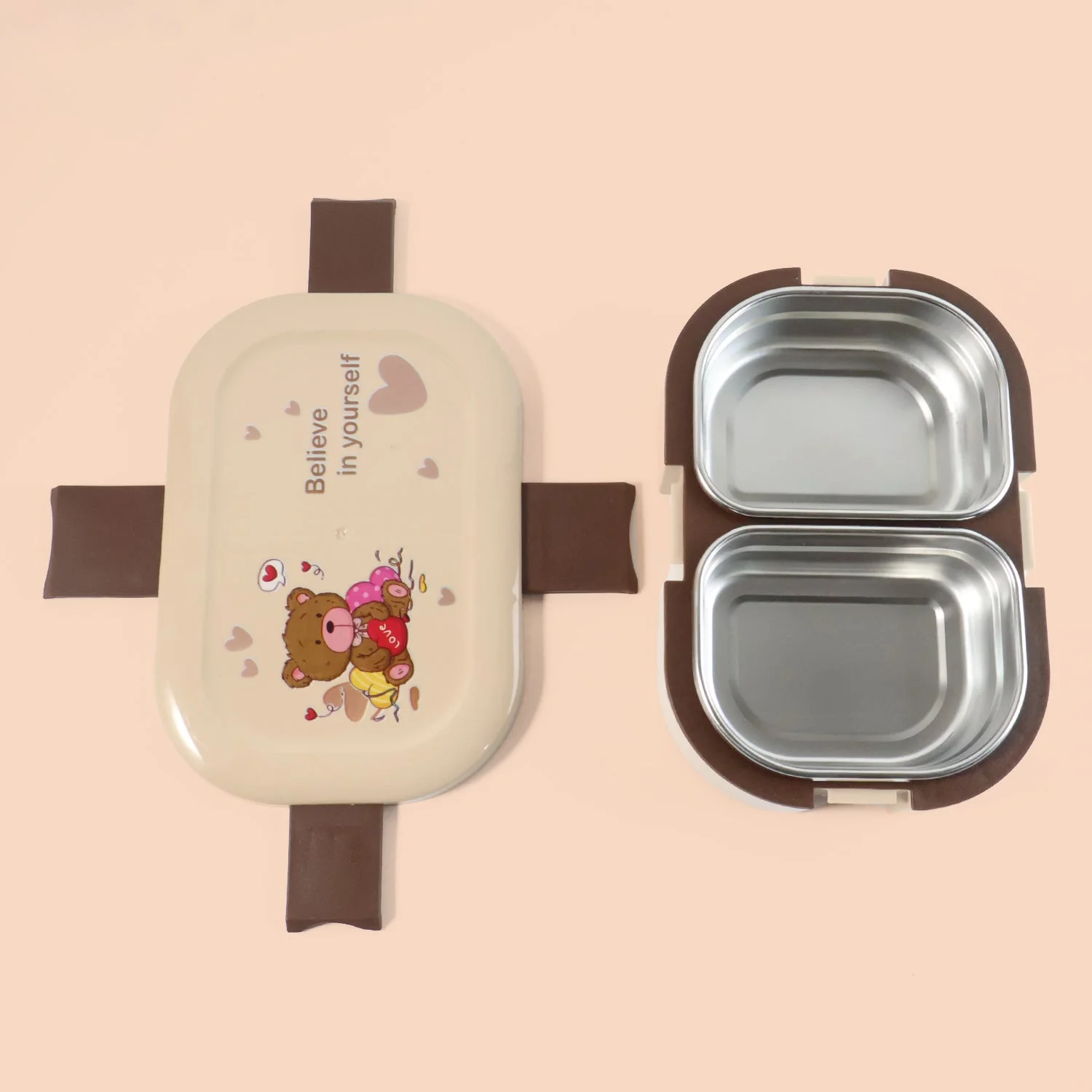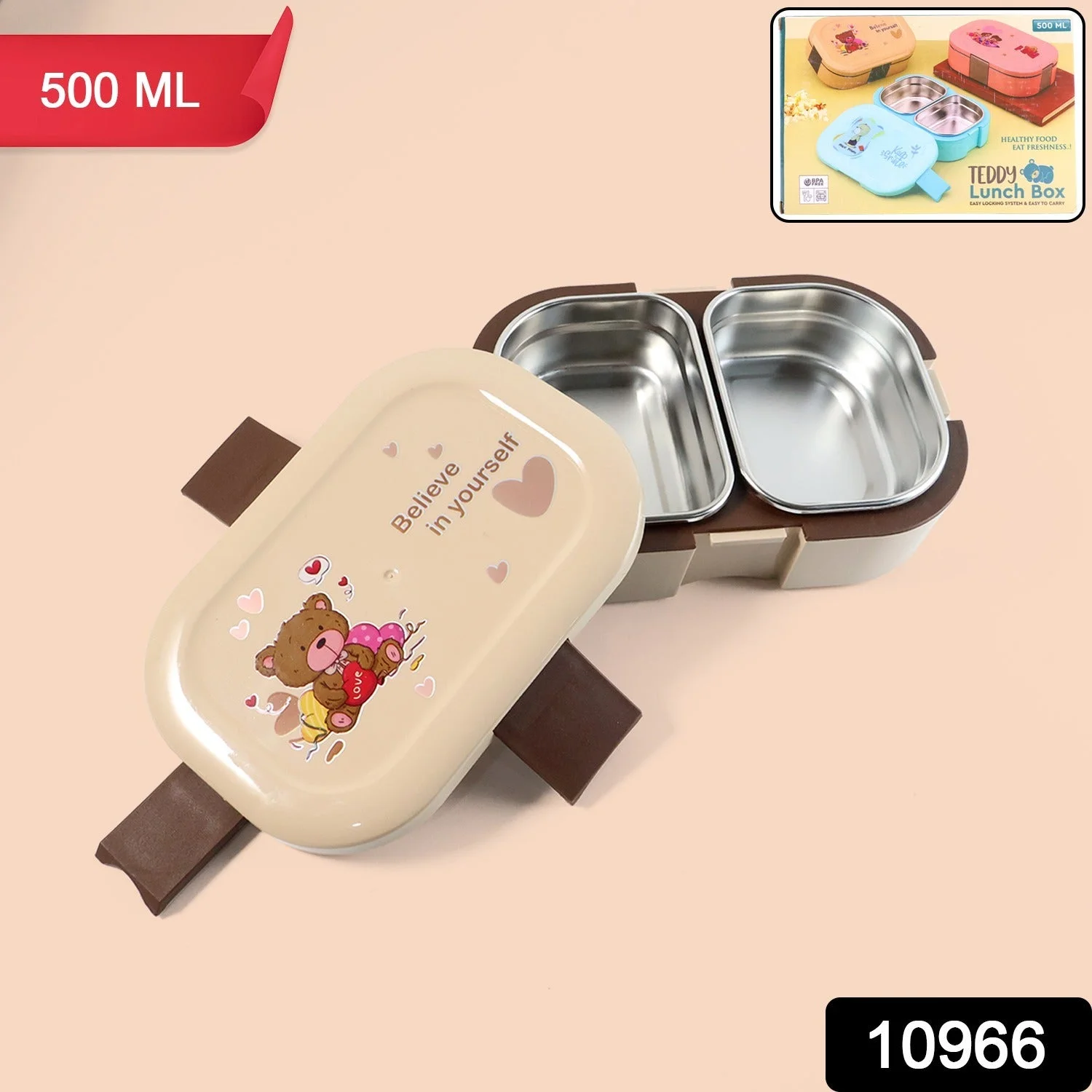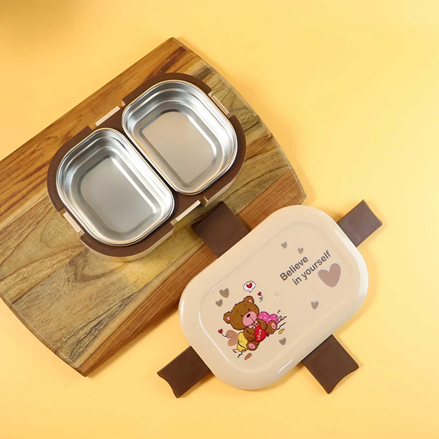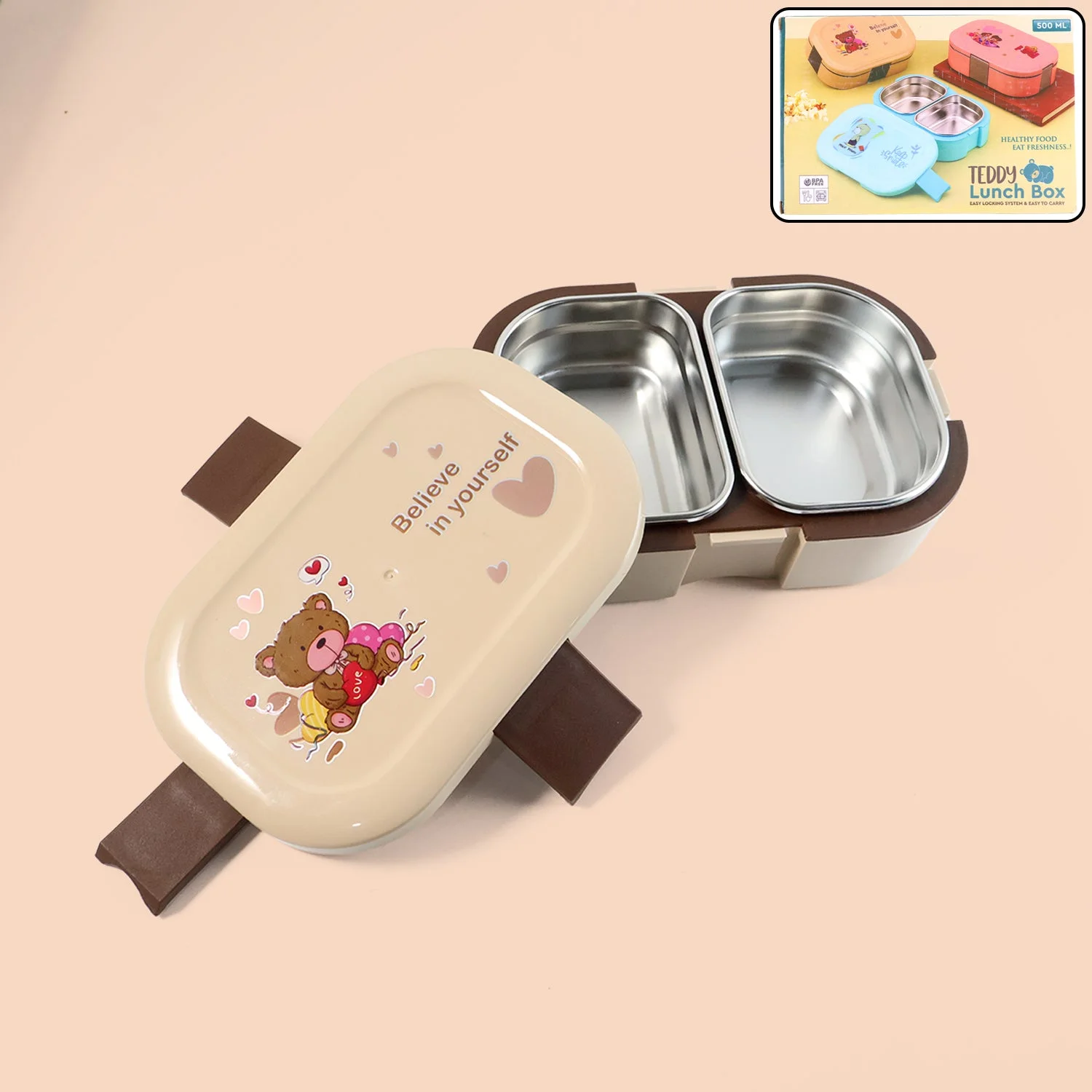 Cute Teddy Printed Kids Lunch Box with Dual Stainless Steel Containers – Durable 500 ML Bento Style Tiffin for School, Travel & Everyday Meals with Secure Side Locks and Motivational Lid Design