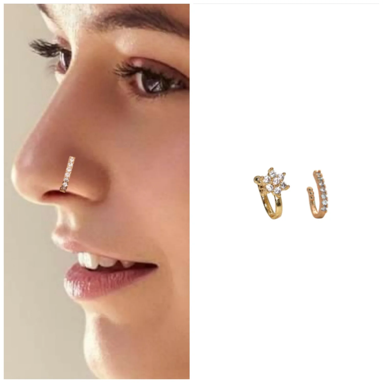 Style 2: Modern Line Nose Cuff: Features a sleek band with a continuous line of clear Cubic Zirconia (CZ) stones in a Gold or Rose Gold plating. Ideal for daily wear, office, or a trendy, minimalist look.