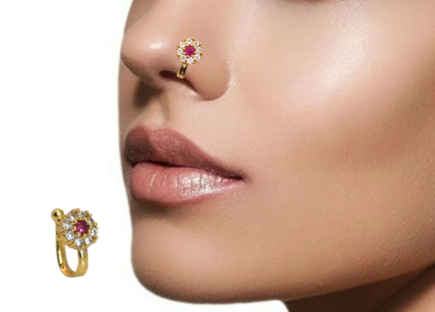 Style 1: Traditional Flower Nath: Features a classic gold-plated floral design with a brilliant ruby-colored center stone surrounded by sparkling CZ diamonds. Perfect for festive and ethnic wear.
