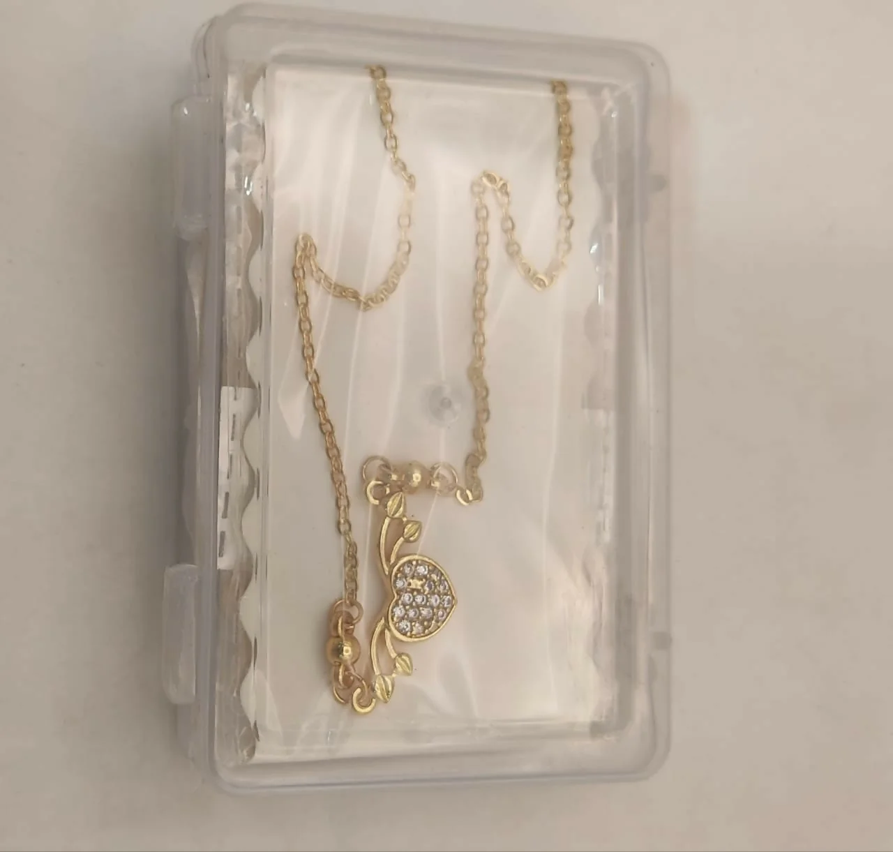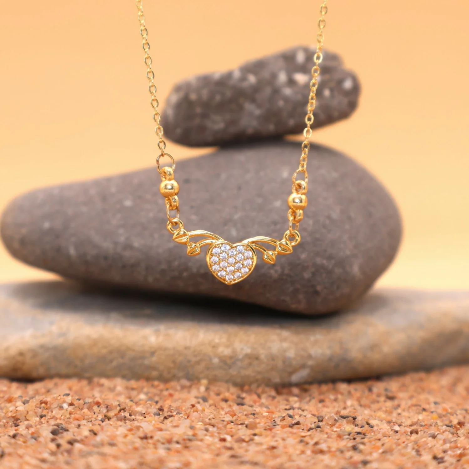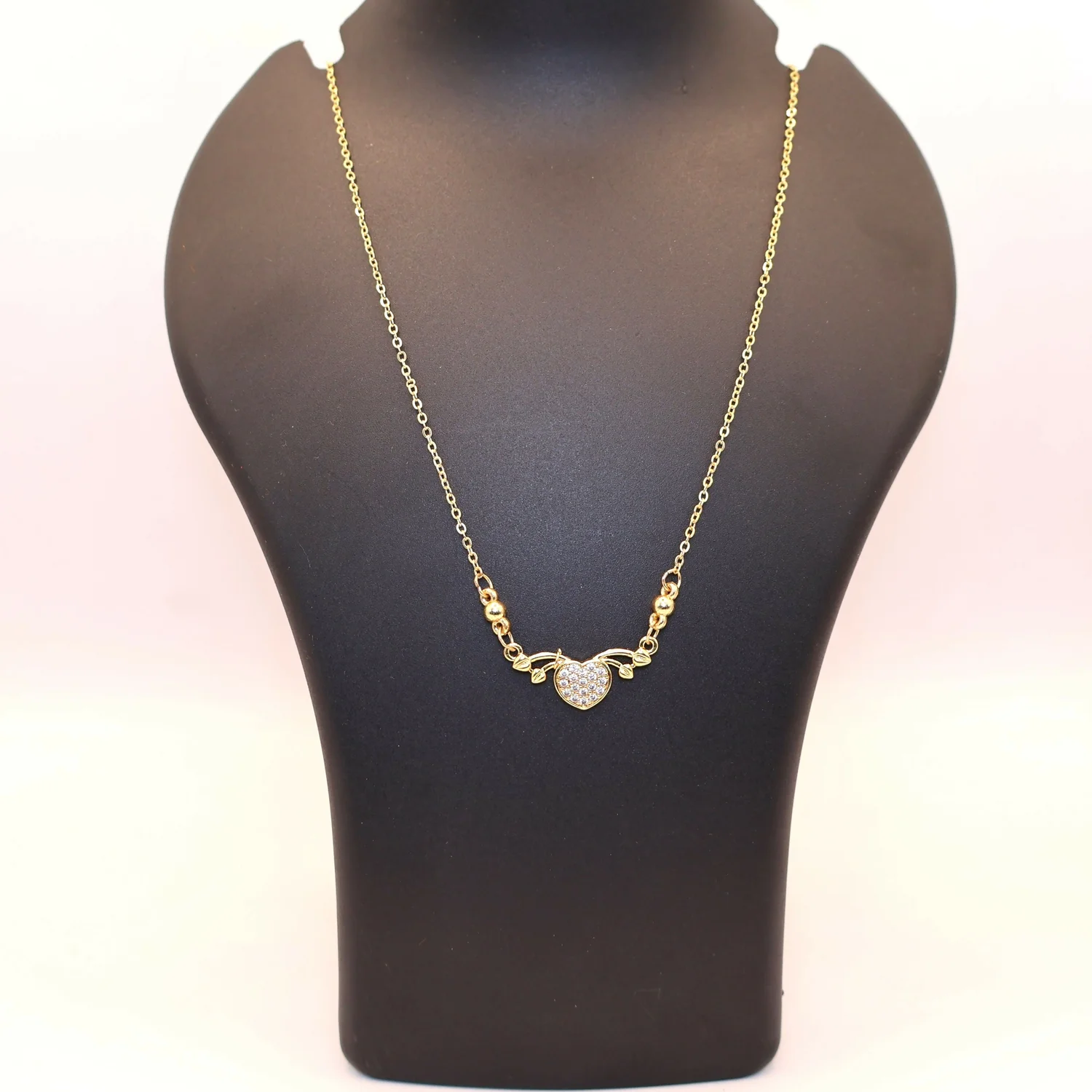 Design: Dainty heart pendant with Pave-set CZ stones and elegant bead/leaf accents.