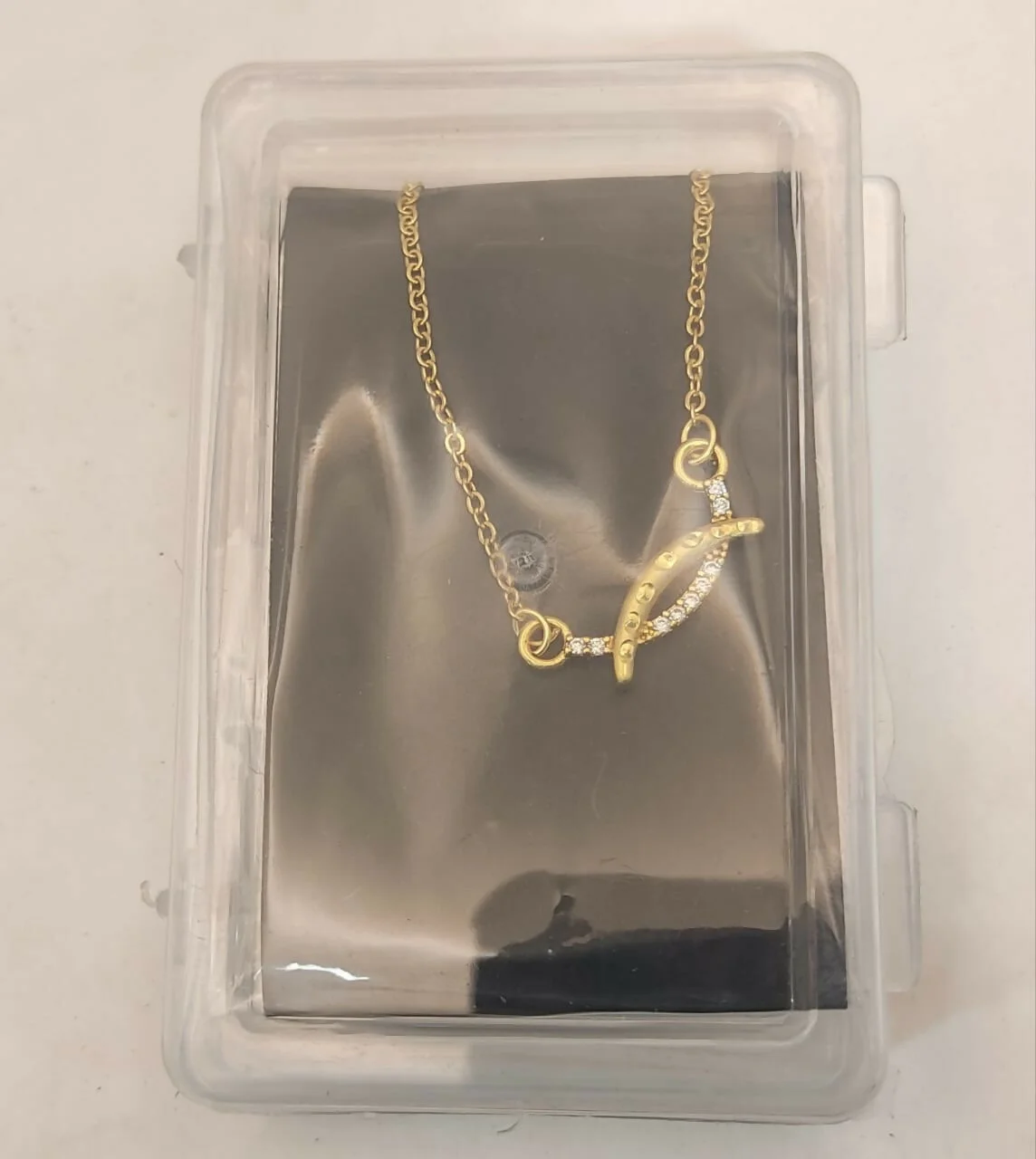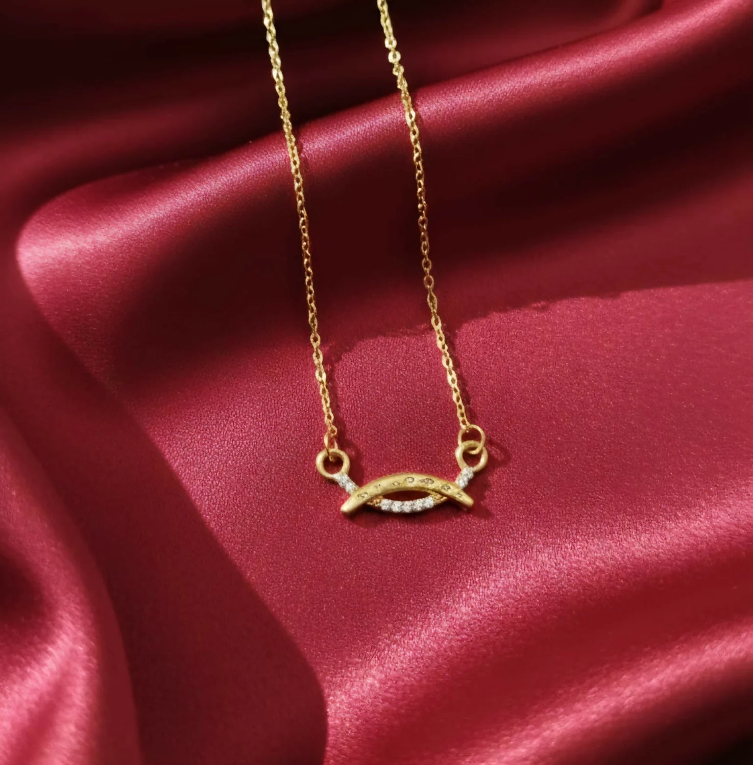 Design: A timeless, minimalist style perfect for layering or wearing solo. The charm has a unique, slightly curved, "fish" or "eyelash" silhouette.