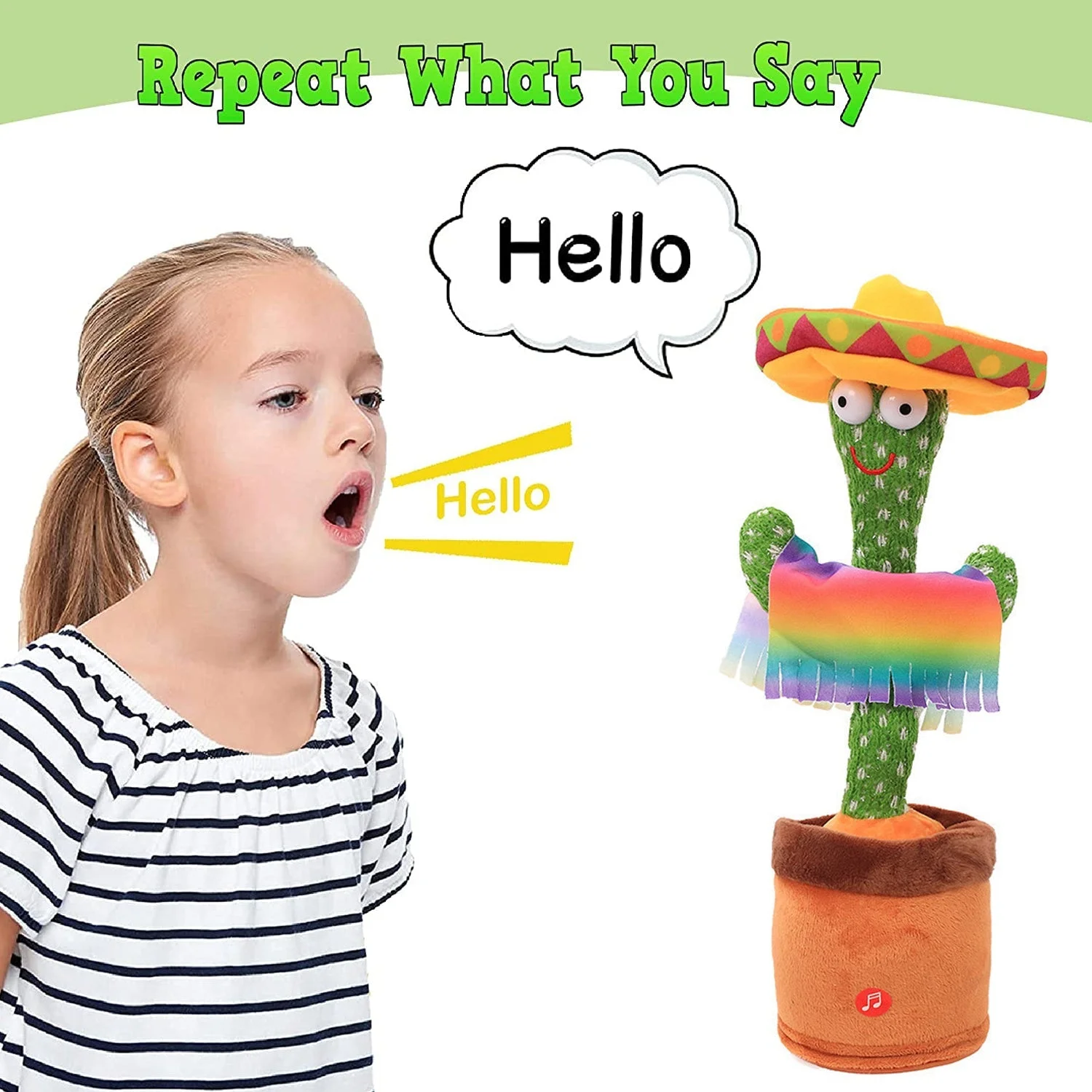 Repeat Cactus Toy Features: Recording Cactus+ Repeating Cactus+Talking Cactus+Mimicking Cactus+Sing Cactus+ Dance Cactus+ Glowing Cactus+Wiggle Cactus, wiggle dancing and singing cactus,cactus toys for kids,This is copying cactus toy,Will bring you a lot of fun