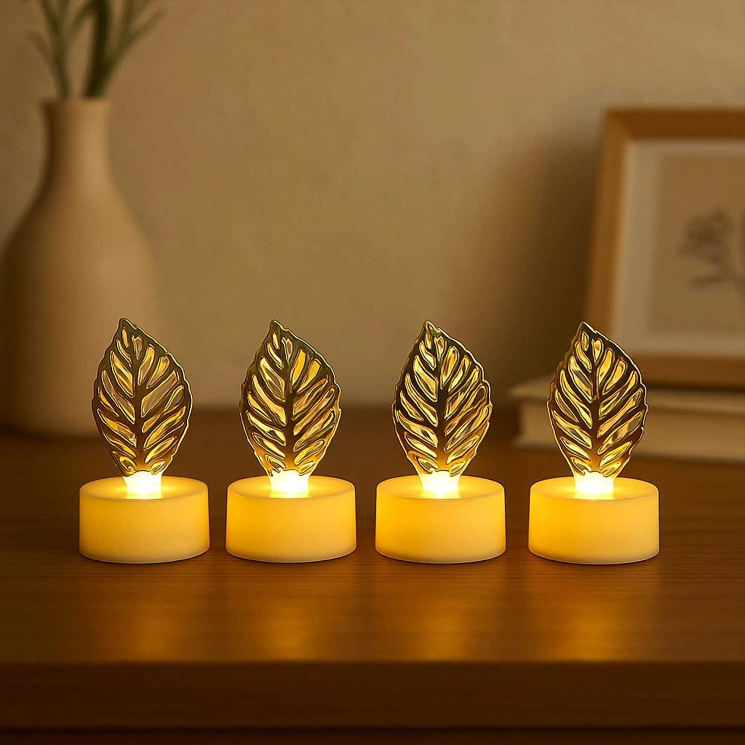 golden leaf LED candles, flameless decorative candles, LED candles for home decor, leaf shaped candles, battery operated candles,reusable flameless candles, elegant LED candles, diya alternative lights, warm glow LED candles, gold decorative lights,LED tealights, candlelight decor, golden theme decor, LED candles for puja