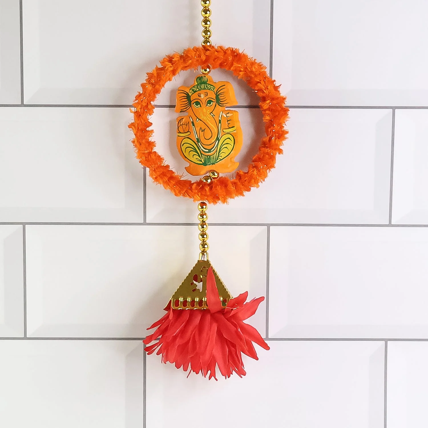 This beautifully designed decorative hanging features an auspicious Lord Ganesha motif, symbolizing prosperity, wisdom, and positivity. Surrounded by a floral-inspired ring with golden bead detailing and a vibrant tassel, it adds a festive and spiritual touch to any space. Perfect for adorning doors, walls, pooja rooms, and temples, this hanging is ideal for festivals, housewarmings, and daily spiritual décor. Lightweight and easy to hang, it creates a welcoming and divine ambiance in homes and offices while serving as an elegant piece of traditional Indian decoration.