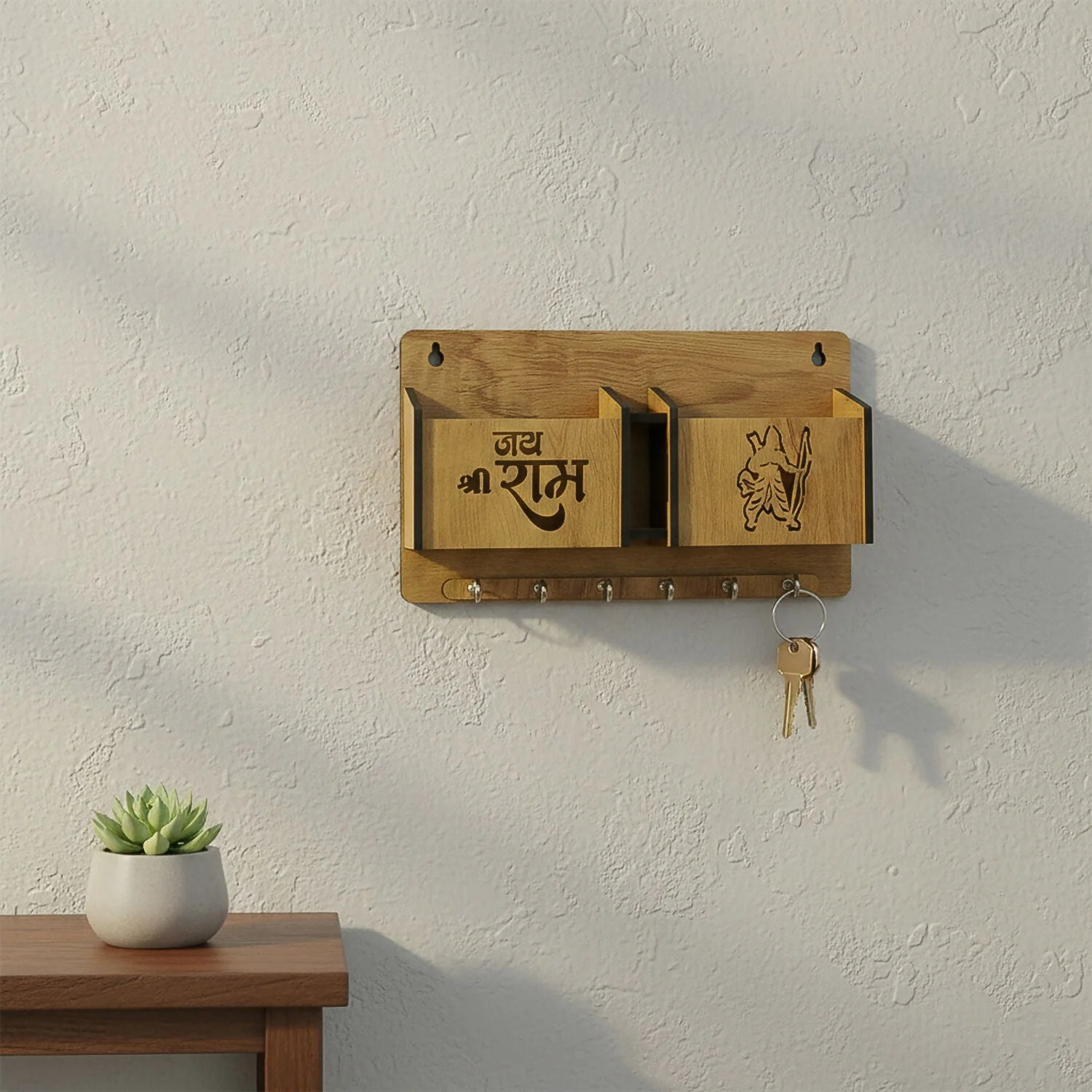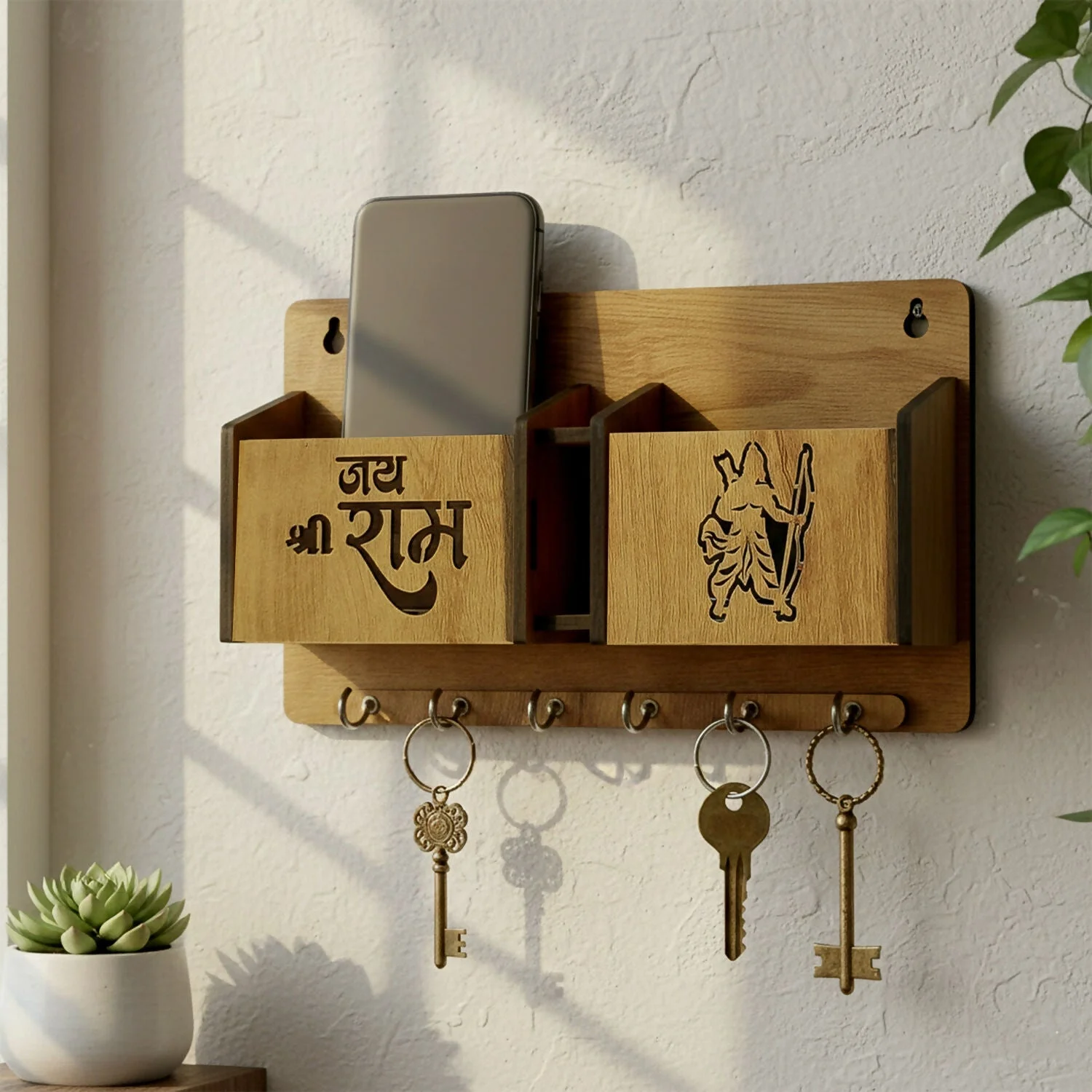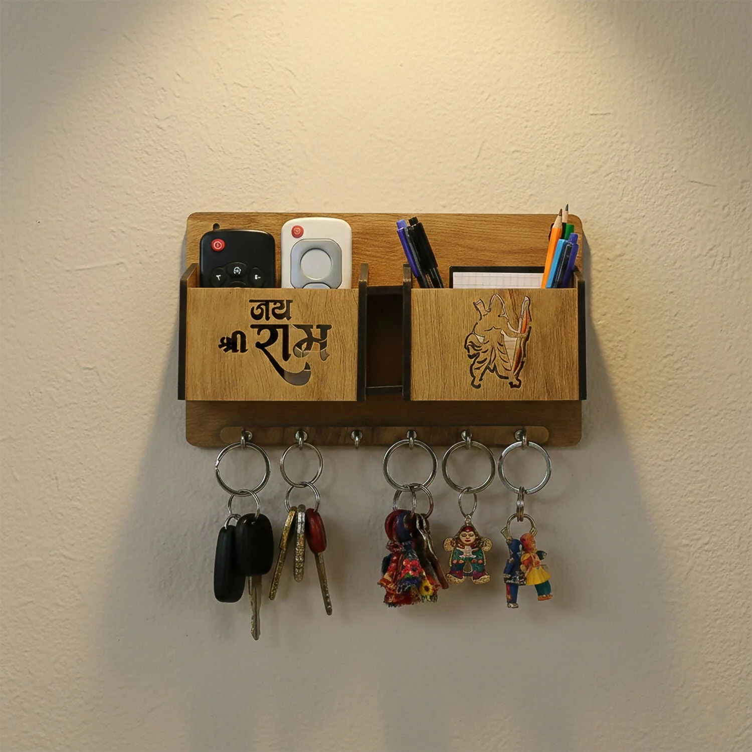 Add a spiritual and organized touch to your entryway with this beautifully crafted wooden wall mounted key holder featuring “Jay Shree Ram” engraving and a decorative Lord Ram silhouette design. Designed for both functionality and décor, this multipurpose wall organizer includes spacious compartments to store your mobile phone, wallet, glasses, remote, letters, or small daily essentials. The built-in mobile stand allows convenient phone placement and easy charging access, while the sturdy metal hooks at the bottom securely hold multiple keys, keychains, and car remotes. Its premium wooden finish enhances the aesthetic of your home, making it perfect for entrances, living rooms, offices, or prayer areas. This elegant wall rack not only keeps your essentials in one accessible place but also adds a meaningful decorative element to your space.