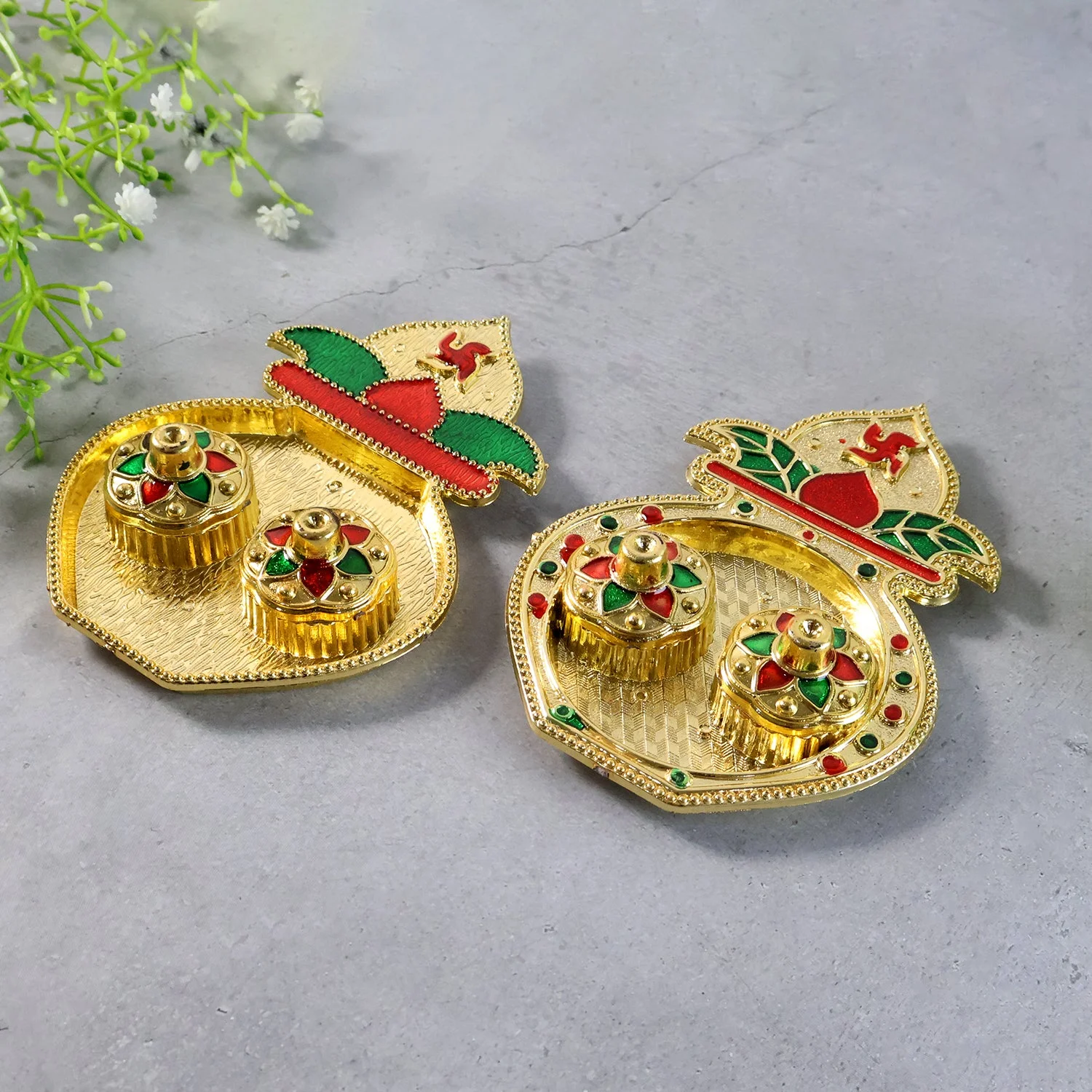 Dual Containers: Two small removable boxes for roli, kumkum, haldi, or chandan.