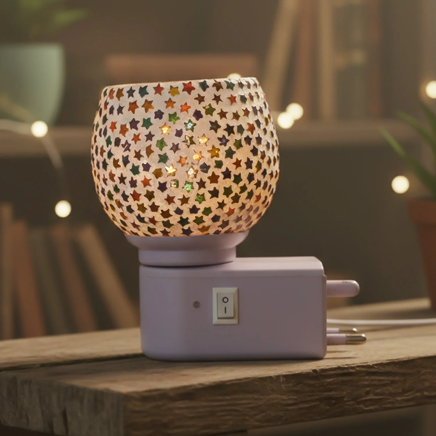This decorative plug-in night lamp is designed with a beautiful star pattern mosaic glass shade that creates a warm and calming glow. The stylish round shade spreads soft light with attractive patterns, making it perfect for creating a cozy ambience in any corner of your home. It comes with a direct plug-in design, making it easy to use in bedrooms, living rooms, hallways, and kids rooms. The built-in ON/OFF switch gives convenient control without unplugging. Ideal for daily use as well as festive decoration, this lamp adds a premium decorative touch while providing gentle lighting at night.