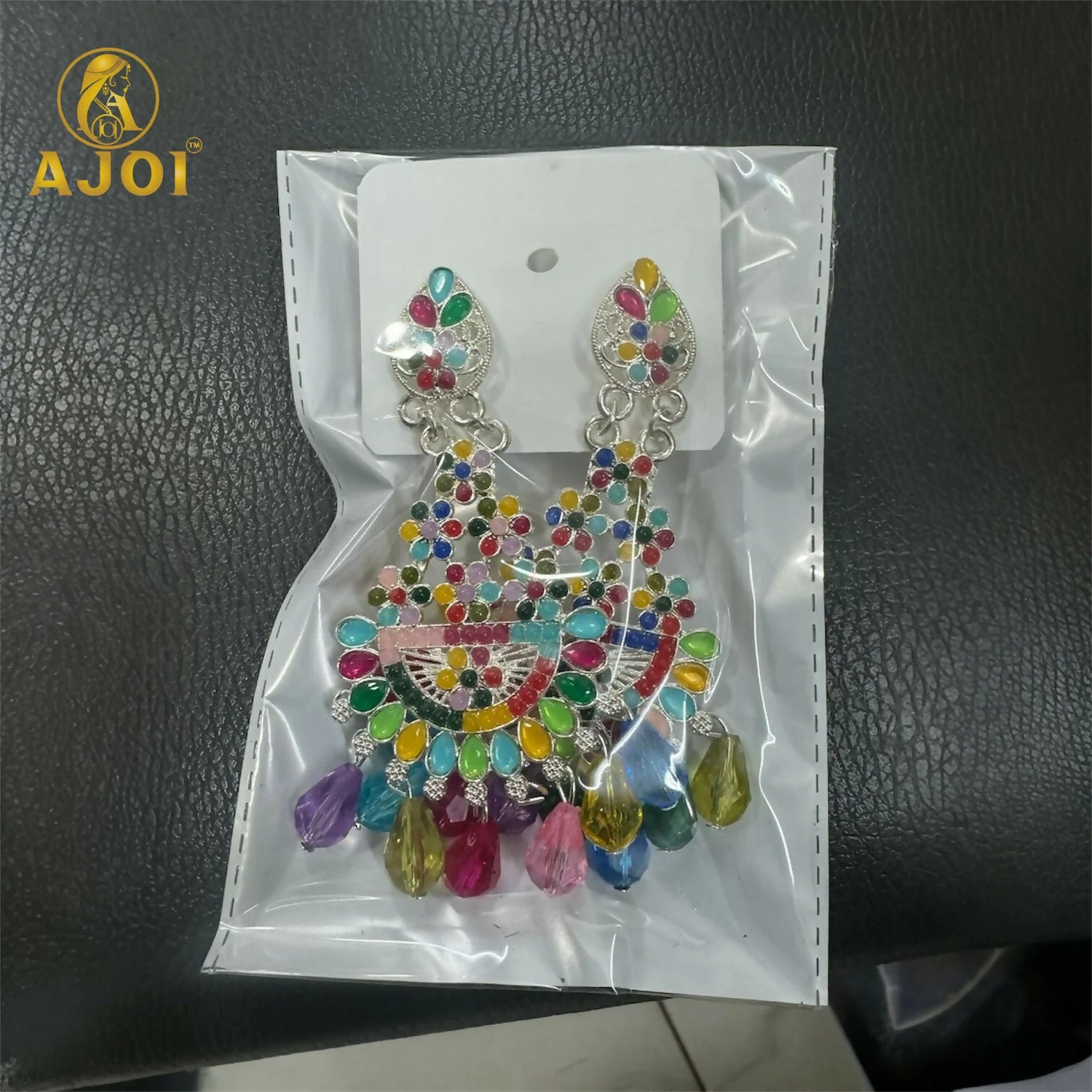The lower section is enhanced with drop-shaped crystal beads in multiple hues, creating a lively and eye-catching effect with every movement. The design is lightweight, yet bold enough to stand out as a statement piece for festive occasions, weddings, parties, and cultural celebrations.
