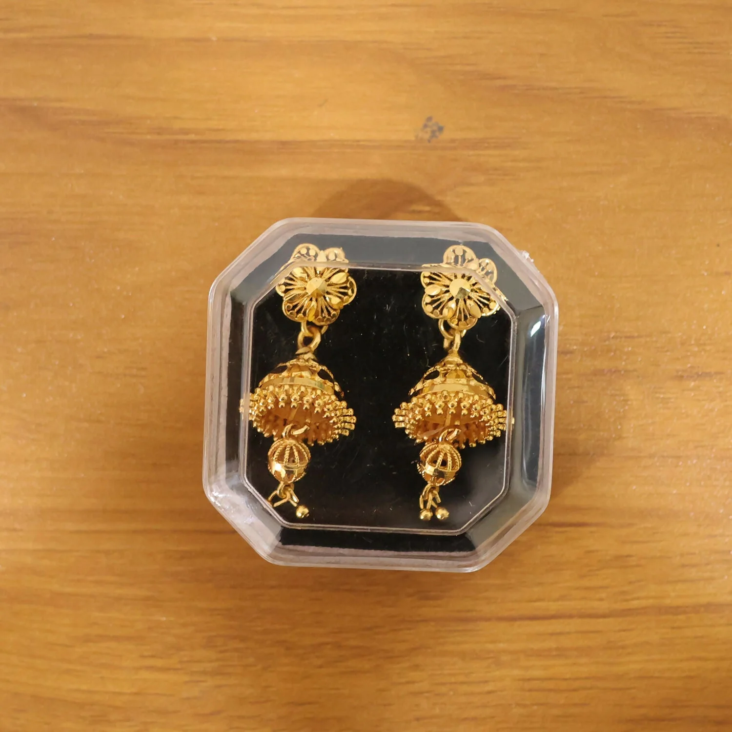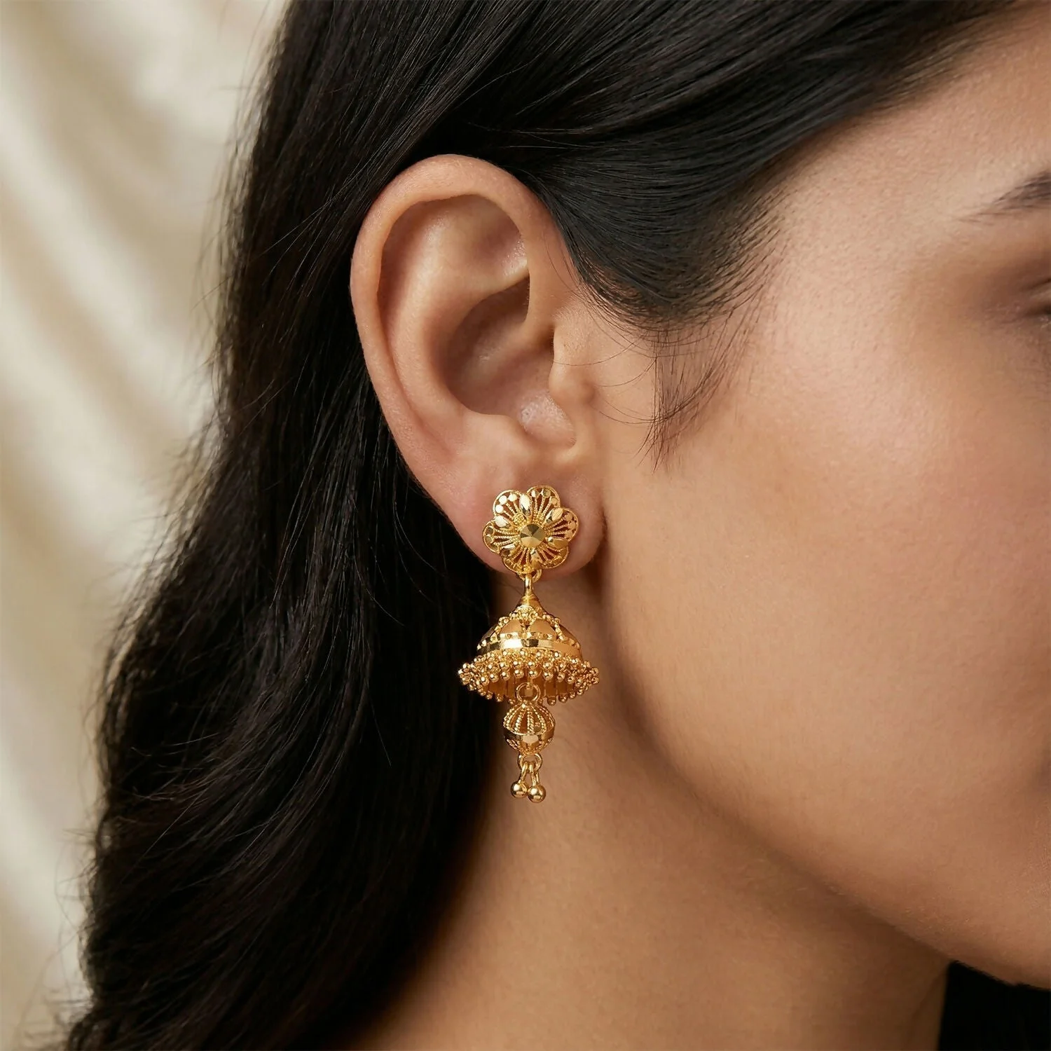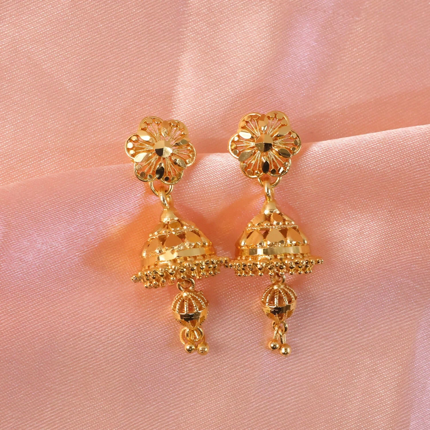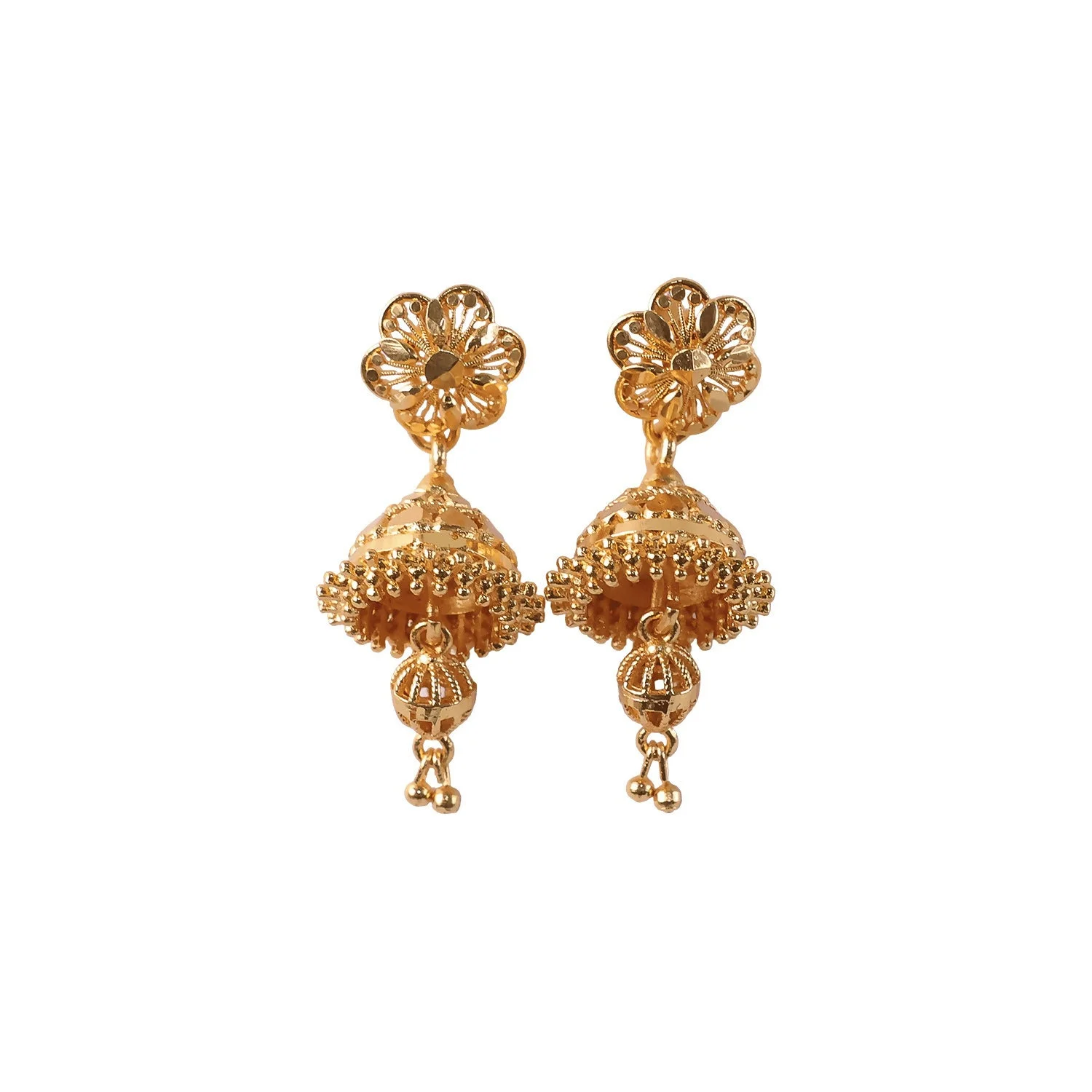 Celebrate timeless elegance with these beautifully crafted traditional gold jhumka earrings. Designed with an intricate floral stud top and a classic bell-shaped jhumka, these earrings showcase fine detailing that reflects rich cultural heritage and graceful craftsmanship. The delicate hanging beads add movement and charm, creating a stunning traditional look.