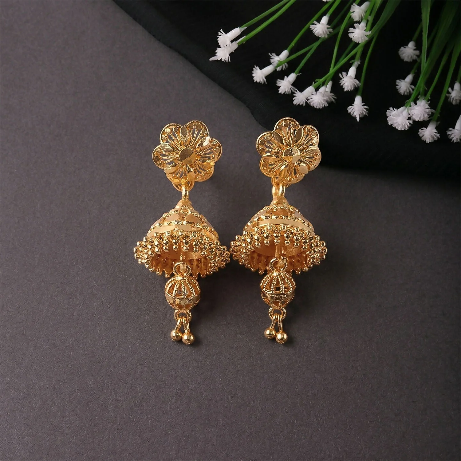 Be the first to review Designer Floral Top Gold Jhumka Earrings – Festive Collection!