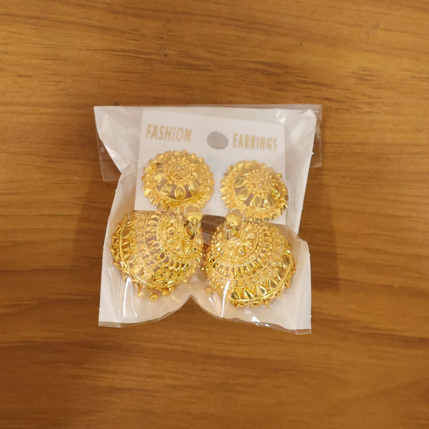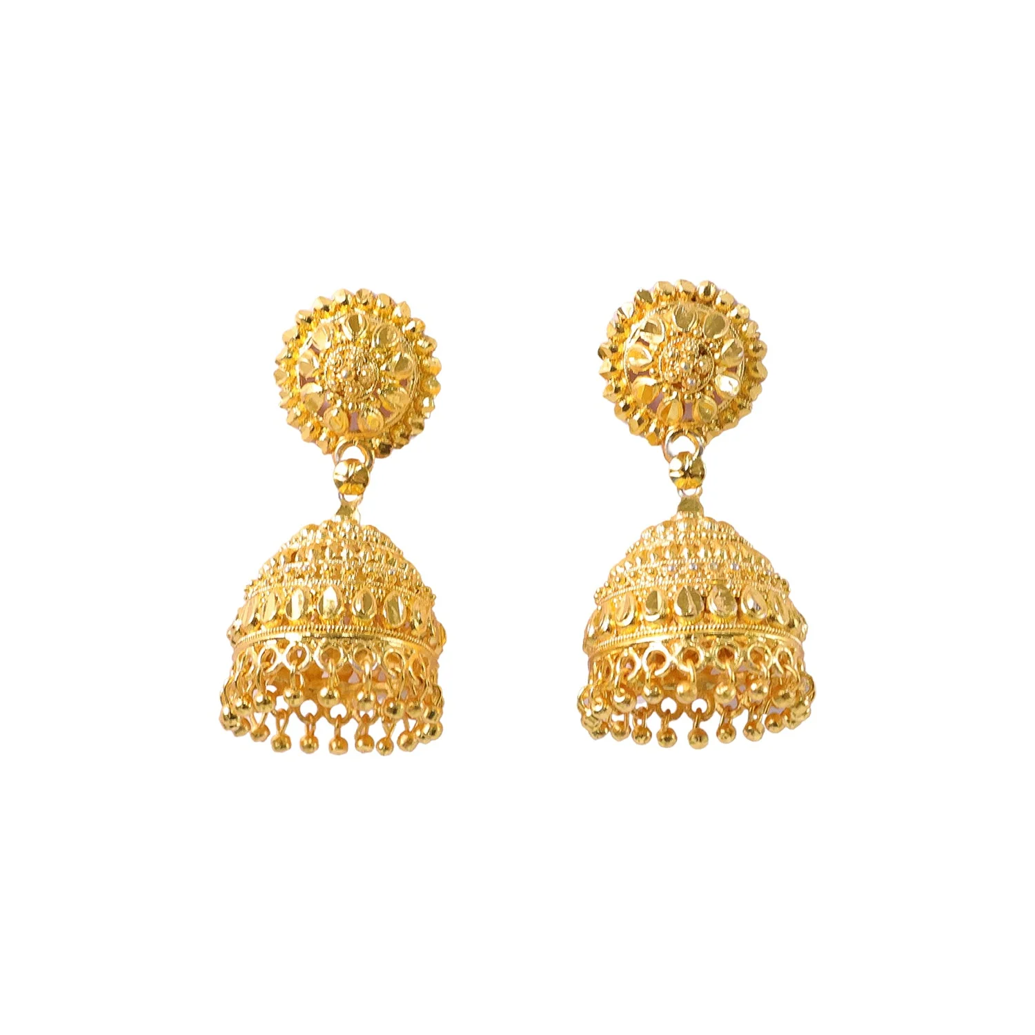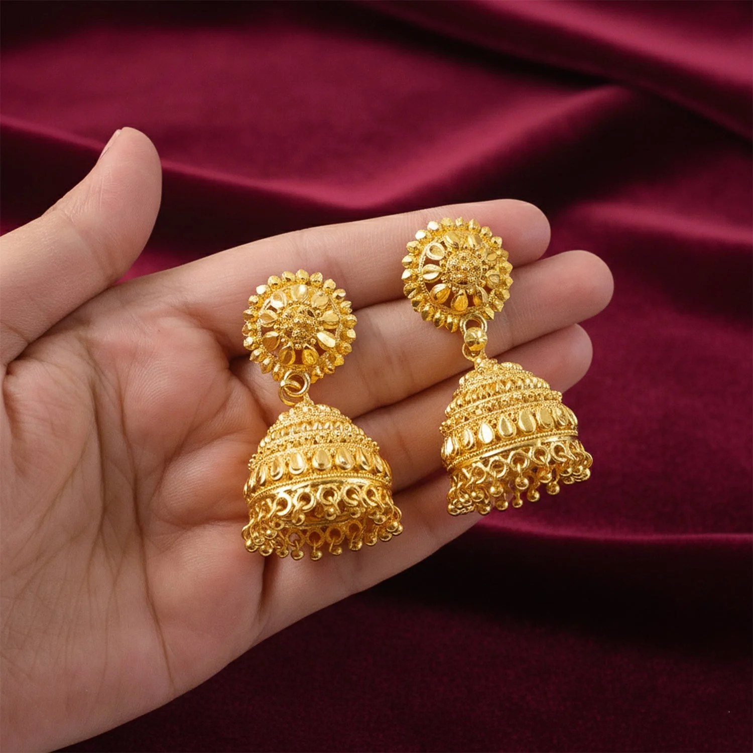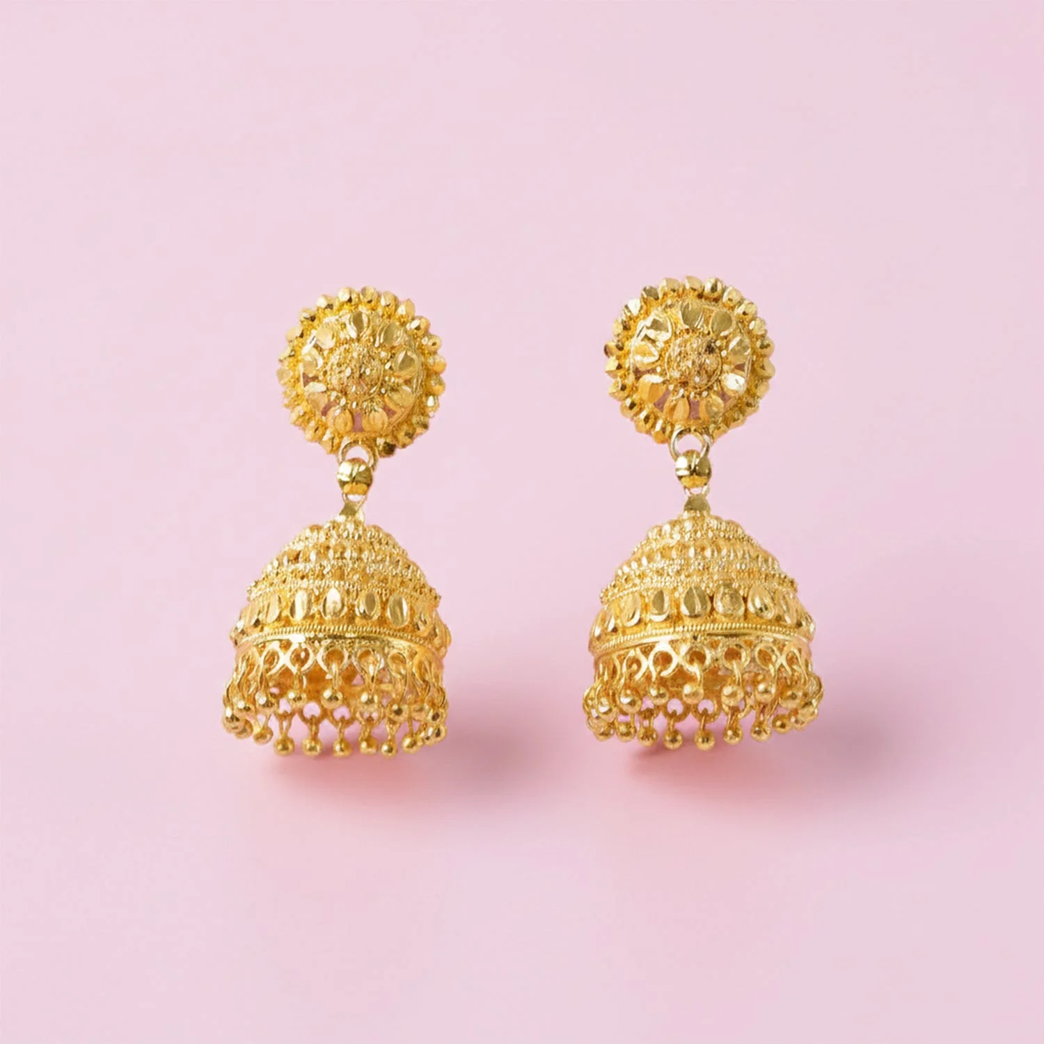 Add timeless elegance to your jewelry collection with these beautifully crafted gold plated jhumka earrings. Designed with a detailed circular stud and a classic dome-shaped jhumka, these earrings showcase intricate traditional craftsmanship. The delicate hanging beads enhance the ethnic charm and create graceful movement while wearing. Perfect for weddings, festivals, parties, and special occasions, they pair beautifully with sarees, lehengas, and other ethnic outfits. Lightweight and stylish, these earrings are an ideal accessory for women and girls who love traditional and fashionable jewelry.