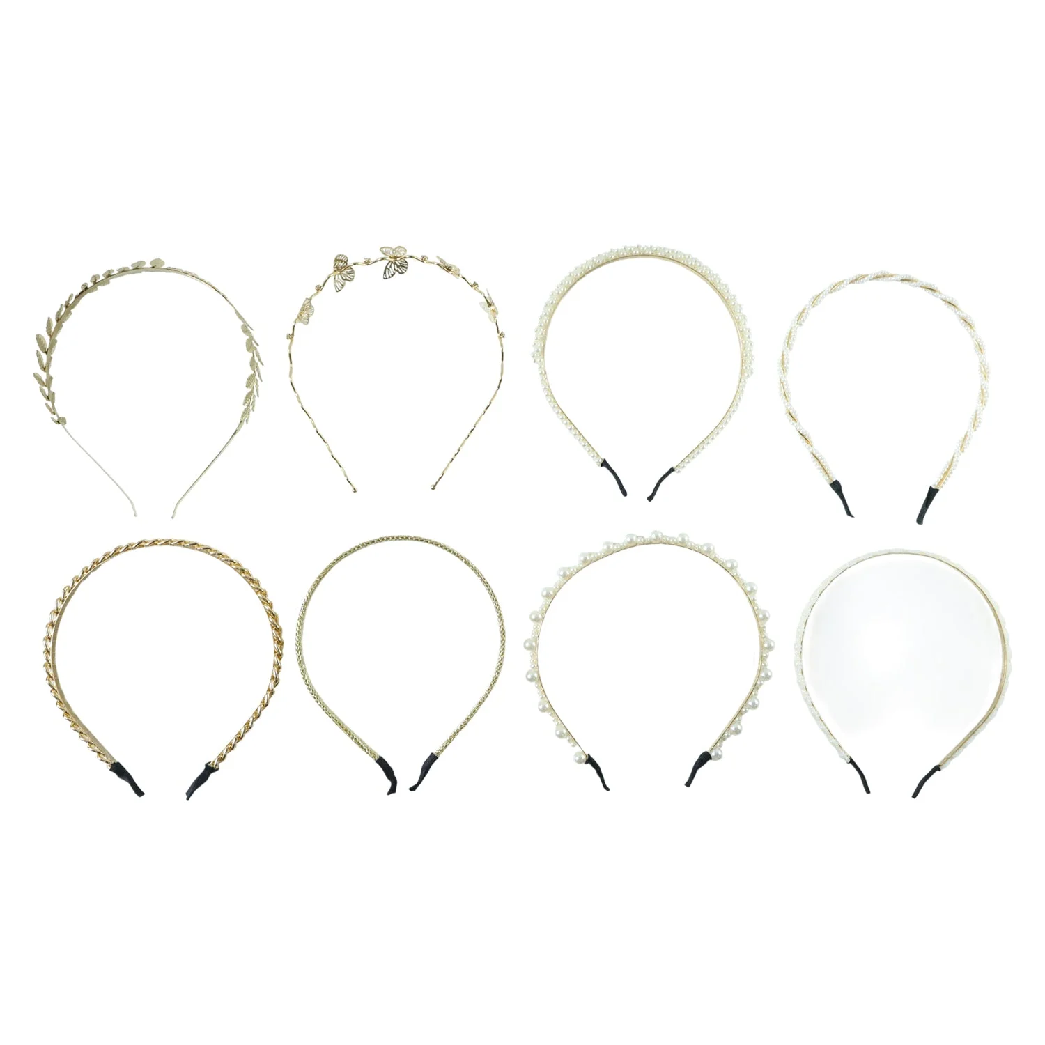 Designer Hair Band Set for Women and Girls Premium Decorative Headband Collection with Pearl Beads Floral Leaf Pattern and Elegant Golden Finish for Party Wedding Daily Wear (8 Pc Set)
