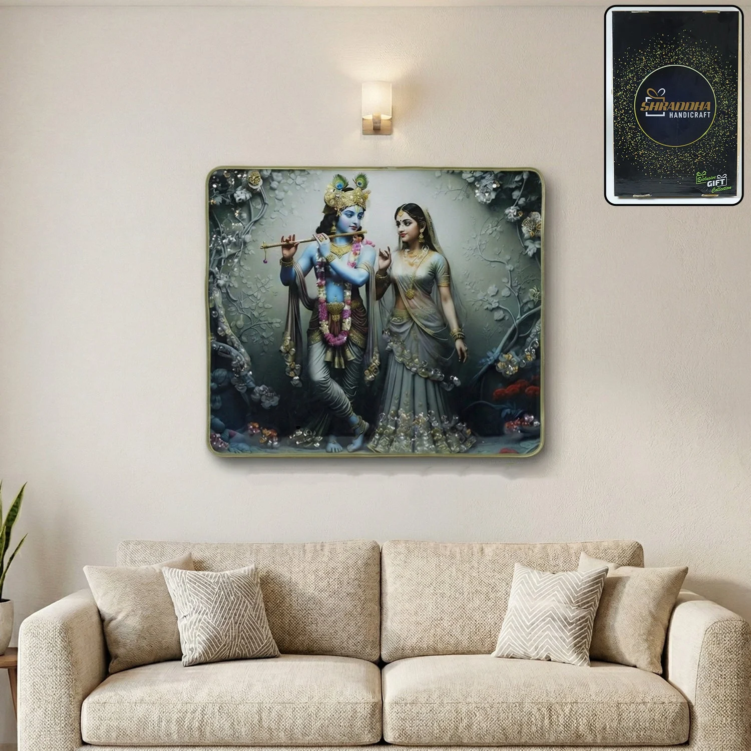 This Krishna flute wall decor India piece adds elegance and devotion to any space, whether used as a spiritual wall frame for home or as a thoughtful gift. Its artistic detailing and divine theme make it ideal for festivals, housewarmings, and religious gifting occasions.