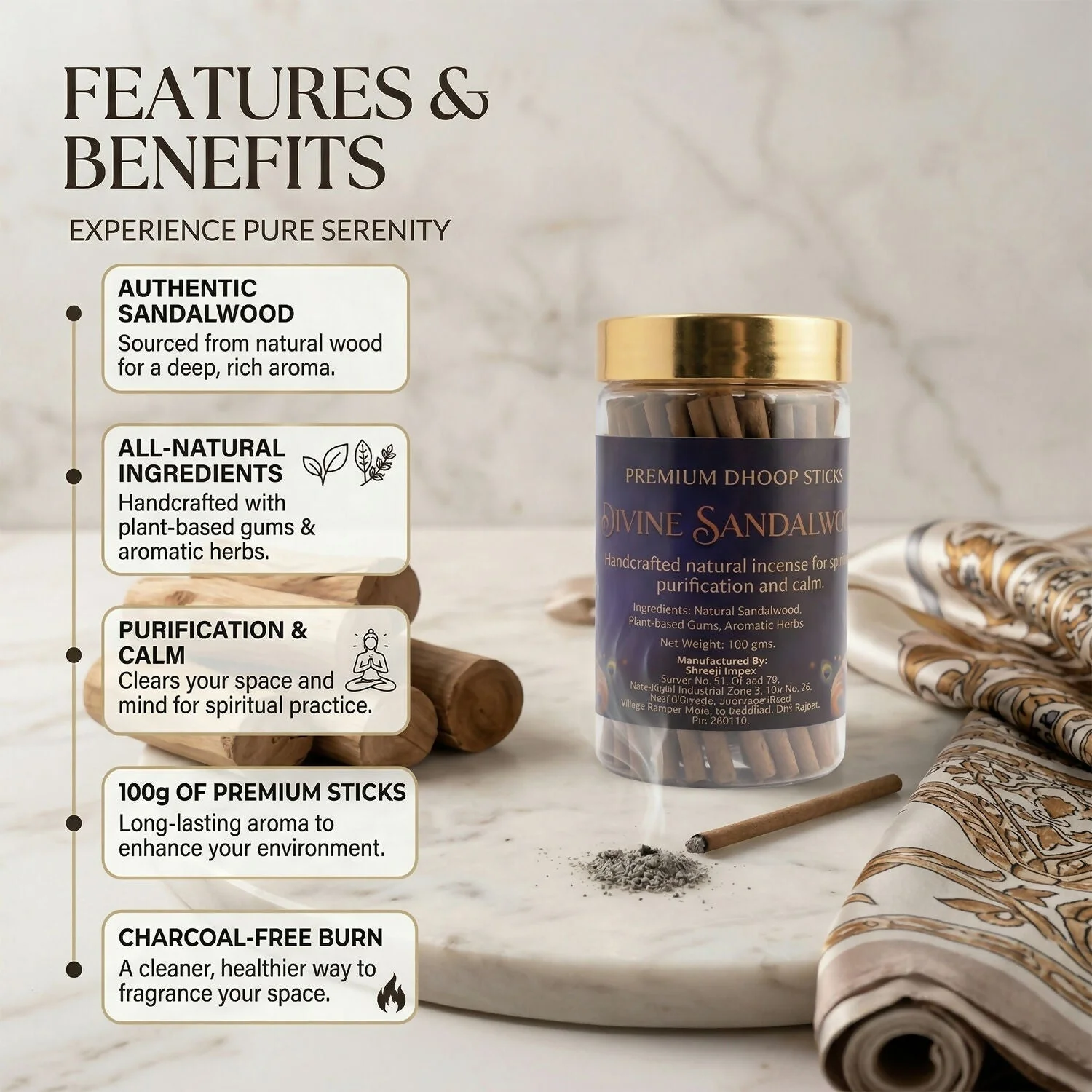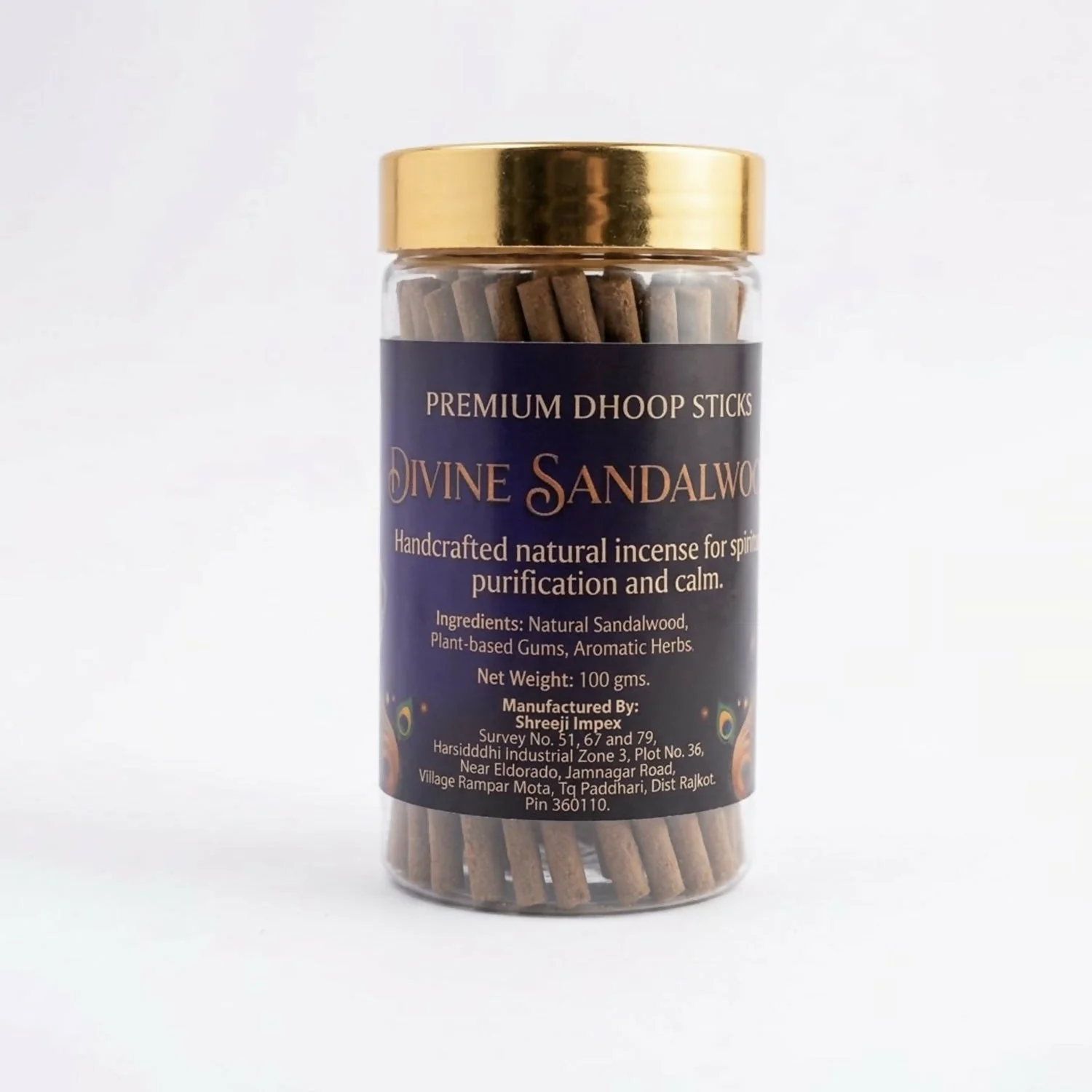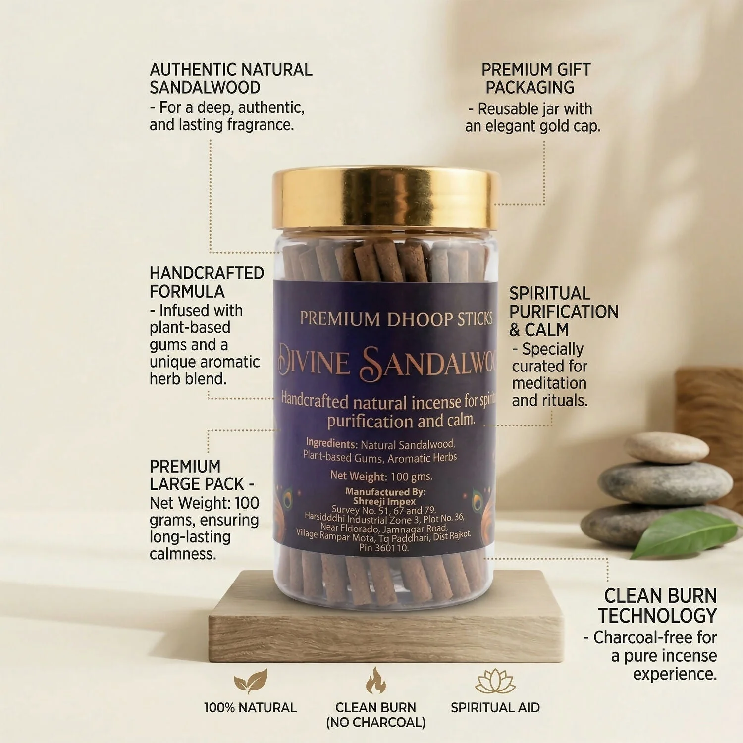 Experience the calming essence of Shreeji Divine Sandalwood Premium Dhoop Sticks, crafted with authentic natural sandalwood and a blend of aromatic herbs. Designed to create a peaceful and serene environment, these incense sticks release a deep, rich fragrance that enhances meditation, pooja, and relaxation rituals. The handcrafted formula ensures a slow and consistent burn, offering long-lasting aroma for your space. Made using plant-based gums and natural ingredients, it provides a clean and soothing incense experience. Packed in a premium reusable jar, it preserves freshness while adding convenience and elegance.