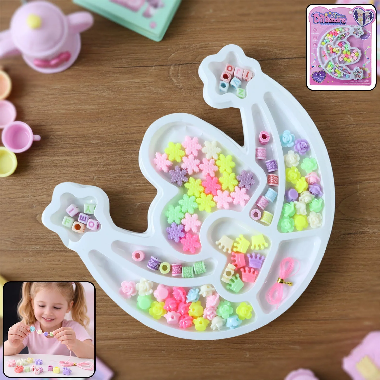 DIY fashion beading kit, jewellery making kit, swan organizer tray, flower beads set, crown beads for crafts, alphabet beads for jewellery, elastic thread for bracelets, handmade bracelet kit, necklace making kit, creative craft set for kids, girls jewellery craft kit, DIY bead crafting set, bracelet and necklace kit, kids arts and crafts set, personalised jewellery making kit