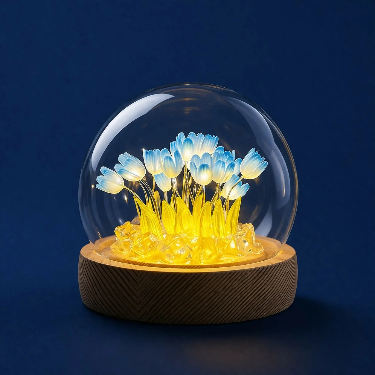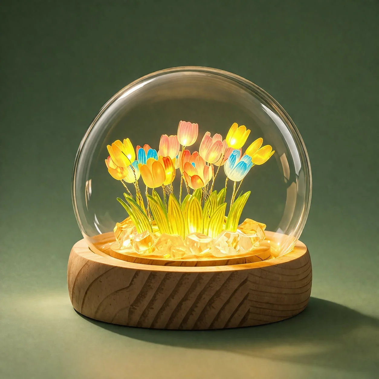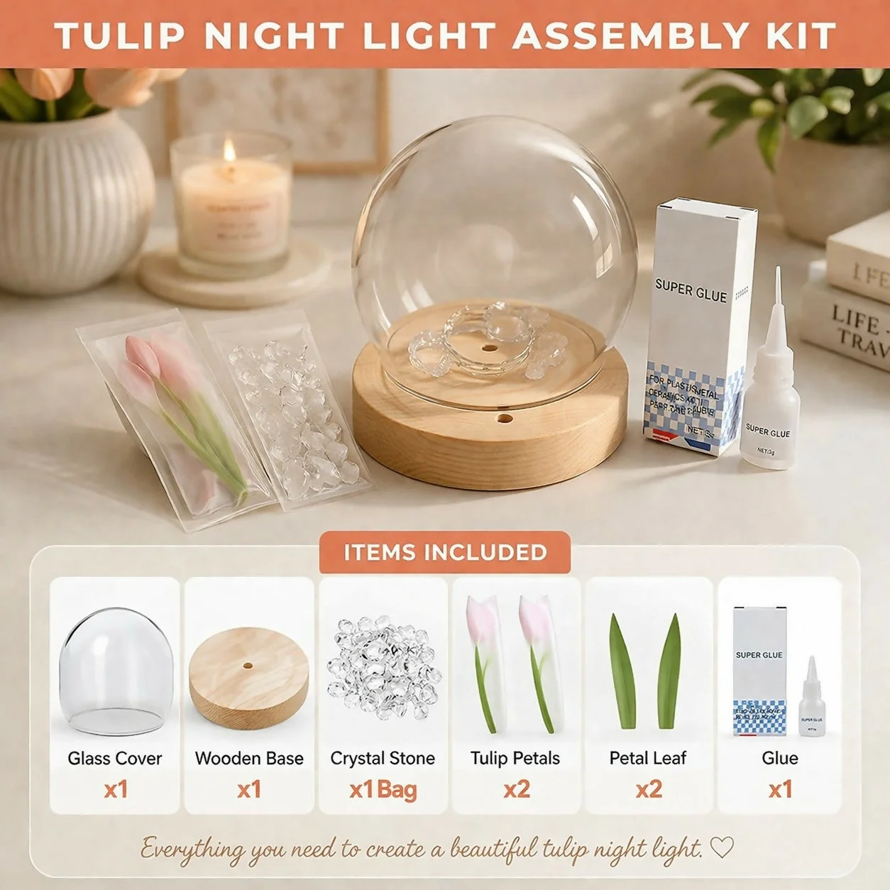Add a creative and elegant touch to your space with this DIY tulip night light kit. Designed with a clear glass dome and a wooden base, this kit lets you craft a glowing tulip arrangement using included petals, leaves, and crystal stones. The built-in LED light emits a soft, warm glow, making it perfect for bedside tables, work desks, or home decor. Easy to assemble and visually appealing, it’s a perfect blend of creativity and functionality.