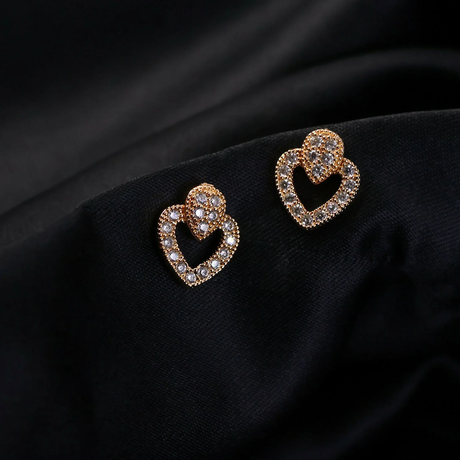 These double heart stud earrings feature a beautifully layered heart design accented with sparkling crystal-style stones for a refined and graceful look. The open-heart silhouette combined with the inner heart detailing adds depth and elegance, making them suitable for both daily wear and special occasions. Designed to sit comfortably on the ear, they provide a balanced blend of charm and sophistication. Their timeless heart-inspired design makes them an excellent choice for gifting on birthdays, anniversaries, or festive moments. A versatile accessory that effortlessly enhances casual, party, and evening outfits.