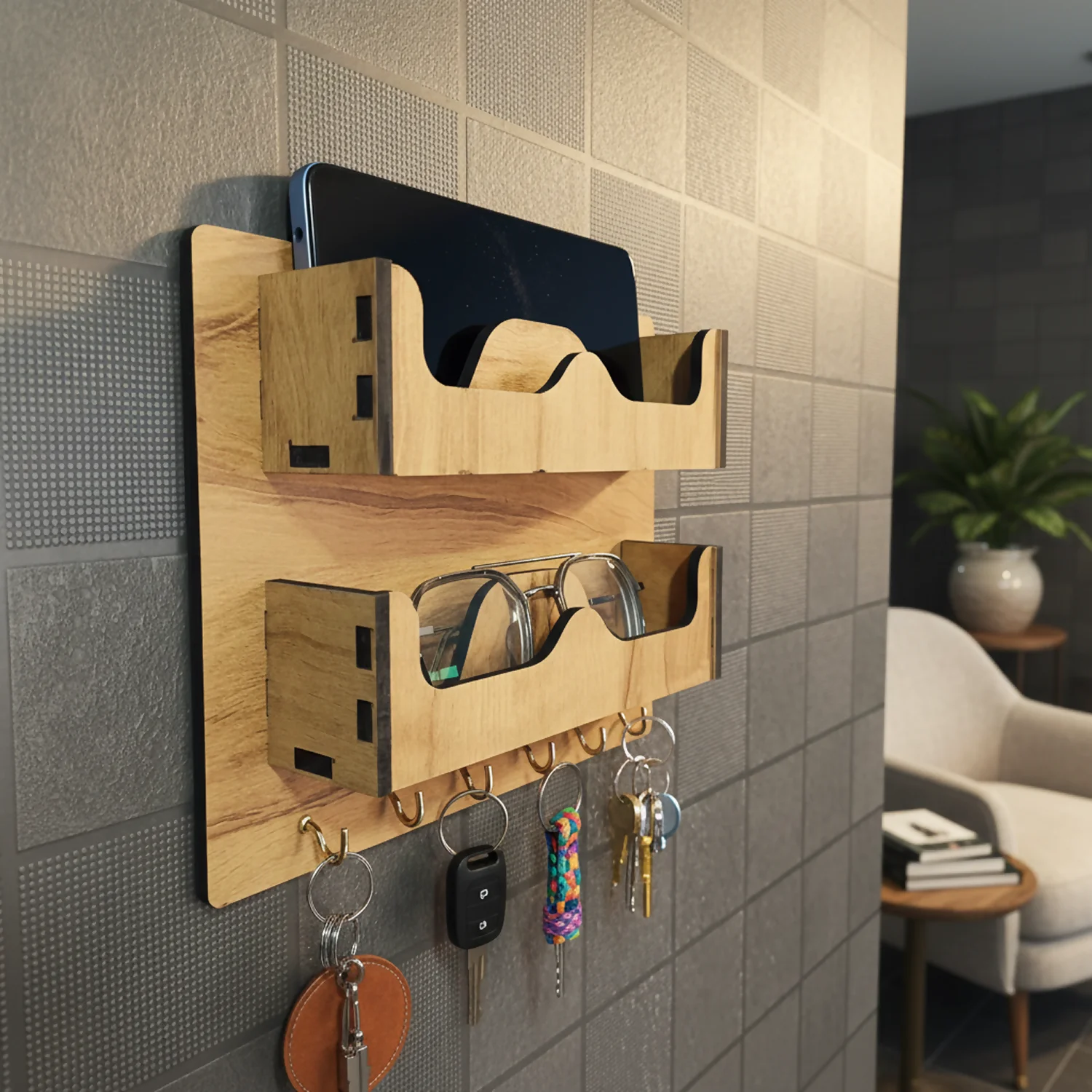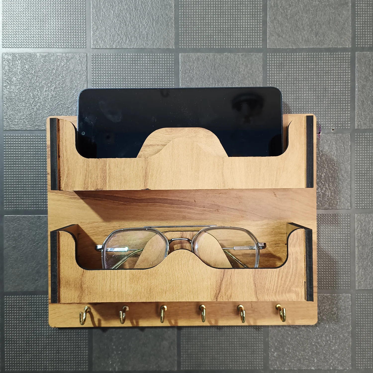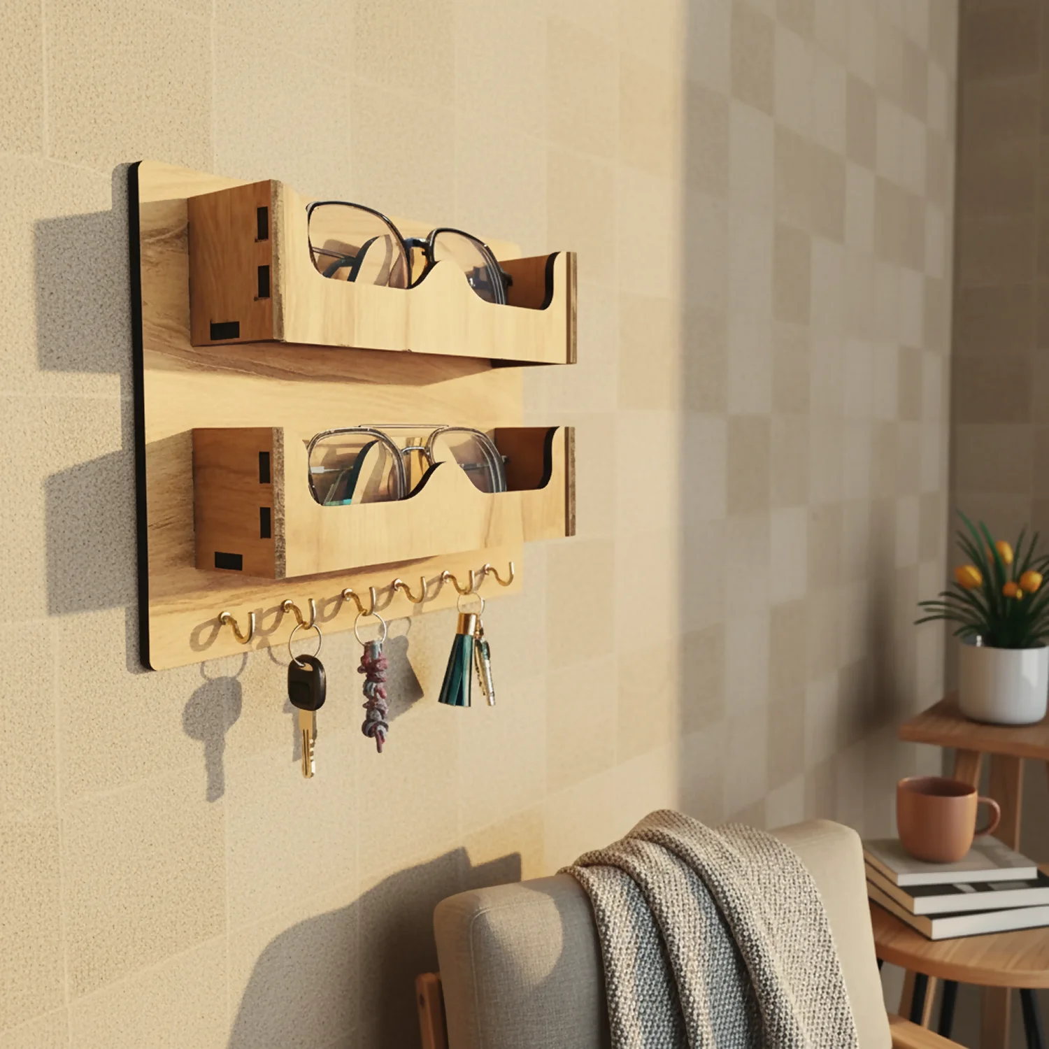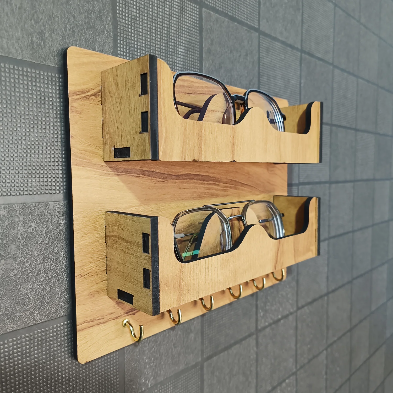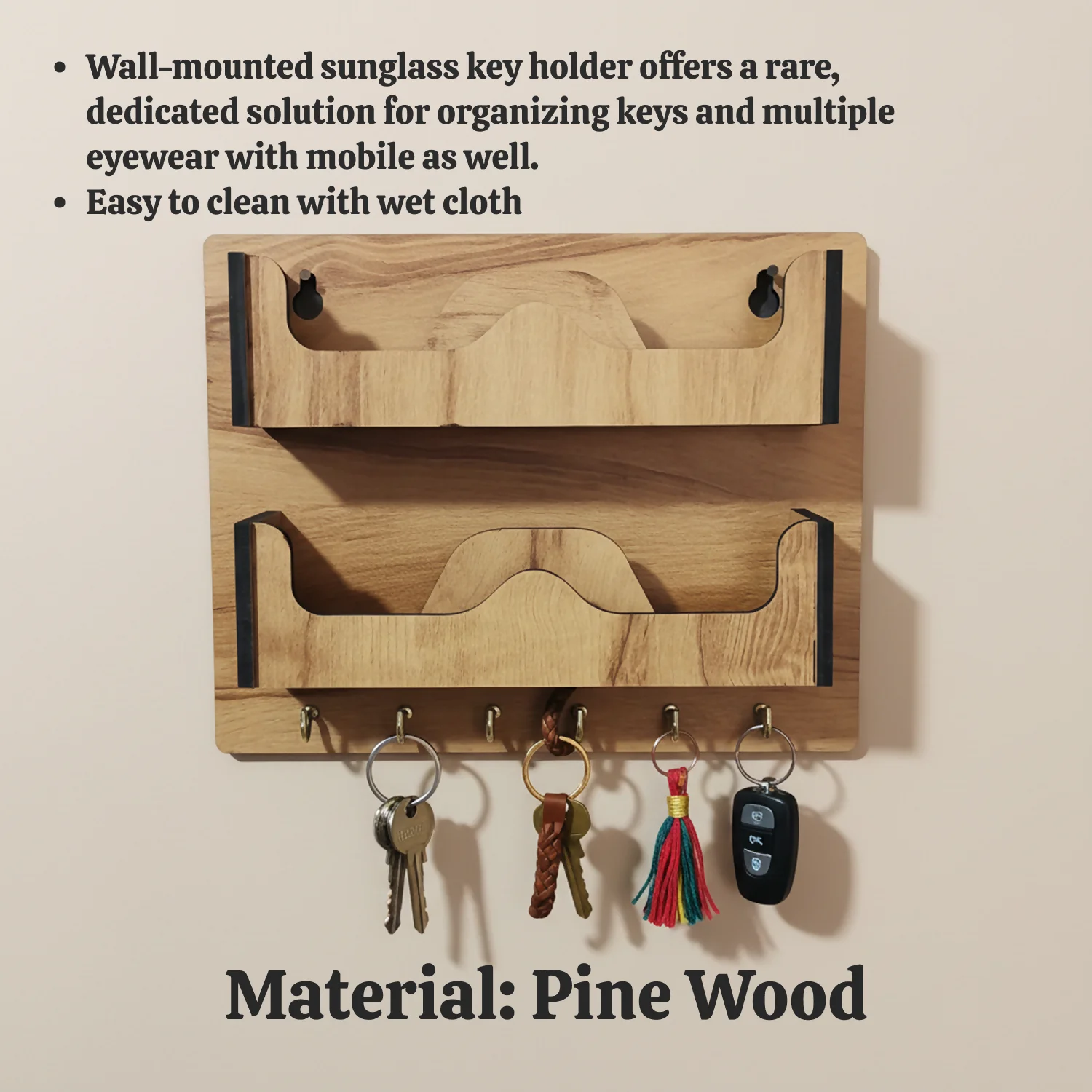 Bring style and organization to your entryway with this premium wooden dual sunglasses and key holder. Crafted from high-quality engineered wood with a smooth natural finish, this wall-mounted organizer is designed to keep your sunglasses, eyeglasses, mobile phone, and keys neatly arranged in one elegant place.