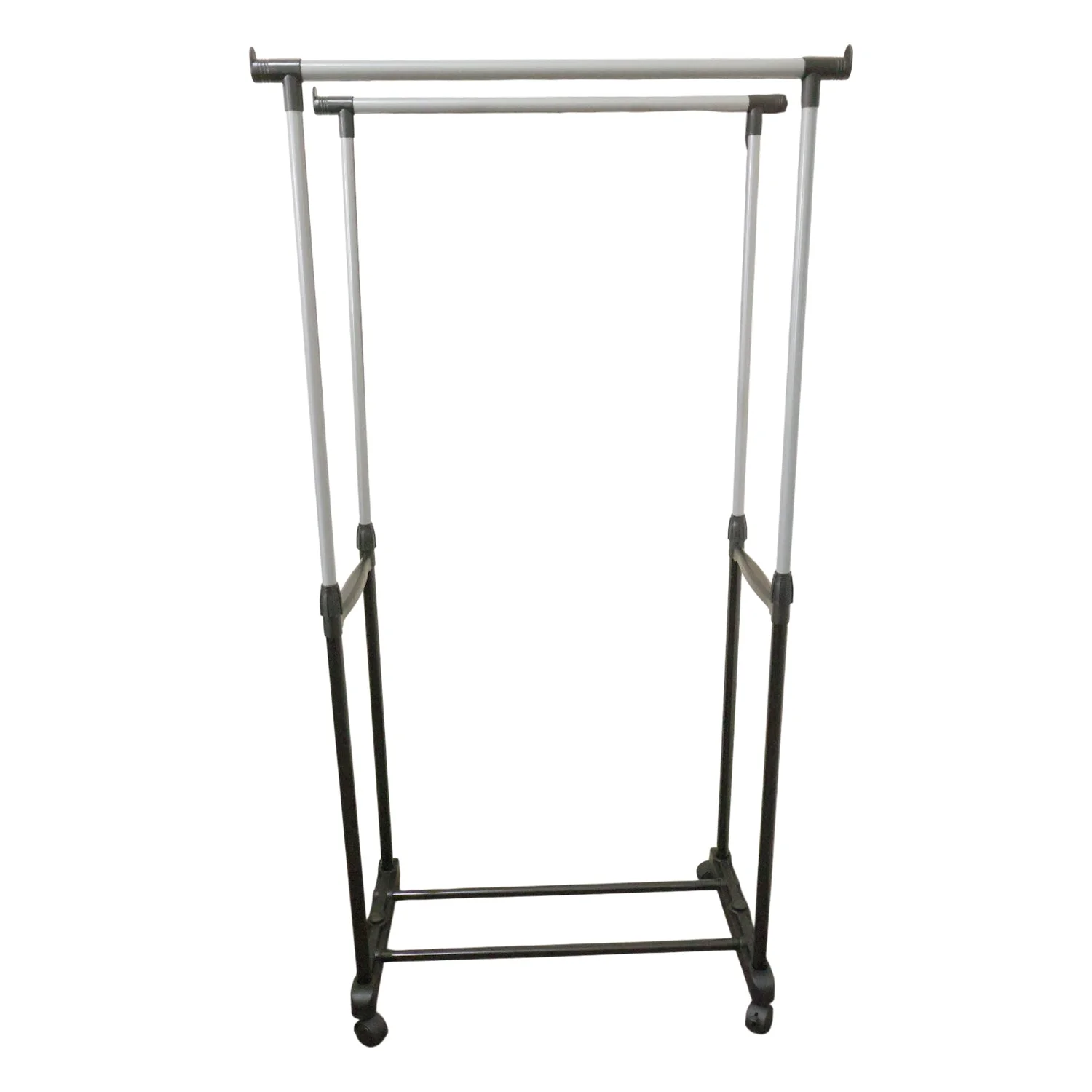 double pole adjustable garment stand, garment rack with wheels, portable clothes hanging rack, rolling clothing rack, wardrobe clothes organizer, laundry garment stand, retail display clothes rack, store use garment rack, home use clothes stand, double bar clothes rack, adjustable height garment rack