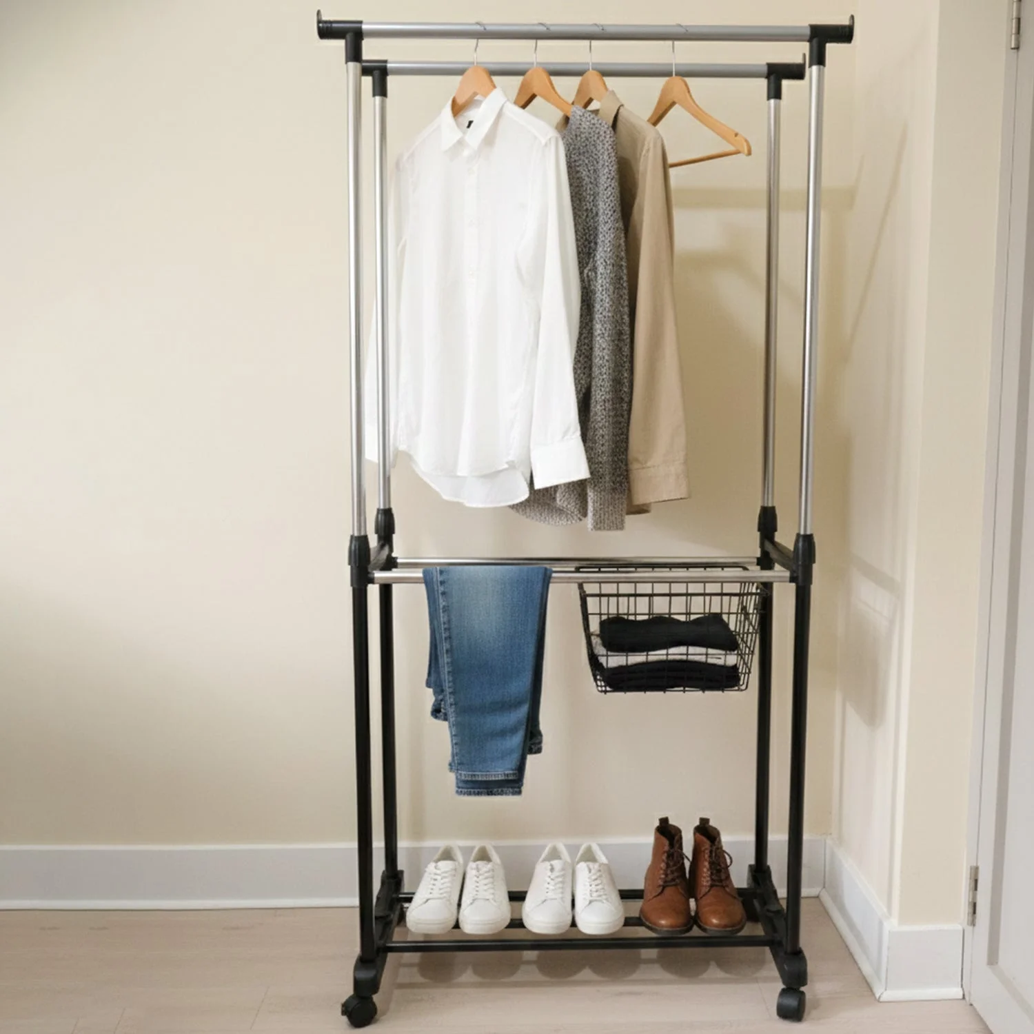 Double Pole Adjustable Garment Stand with Wheels for Home & Store Use – Portable Clothes Hanging Rack for Wardrobe Organization, Laundry & Display Storage