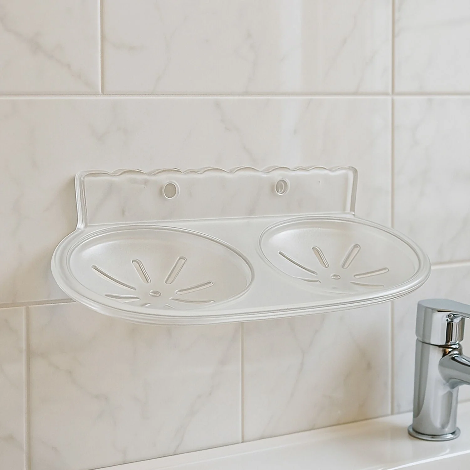Keep your soaps neatly organized and dry with this Wall-Mounted Double Soap Dish Holder made from durable transparent plastic. Featuring two separate soap compartments, this space-saving design is ideal for shared bathrooms or kitchens. The curved base and integrated drainage channels prevent water accumulation, keeping your soap dry and longer-lasting.
