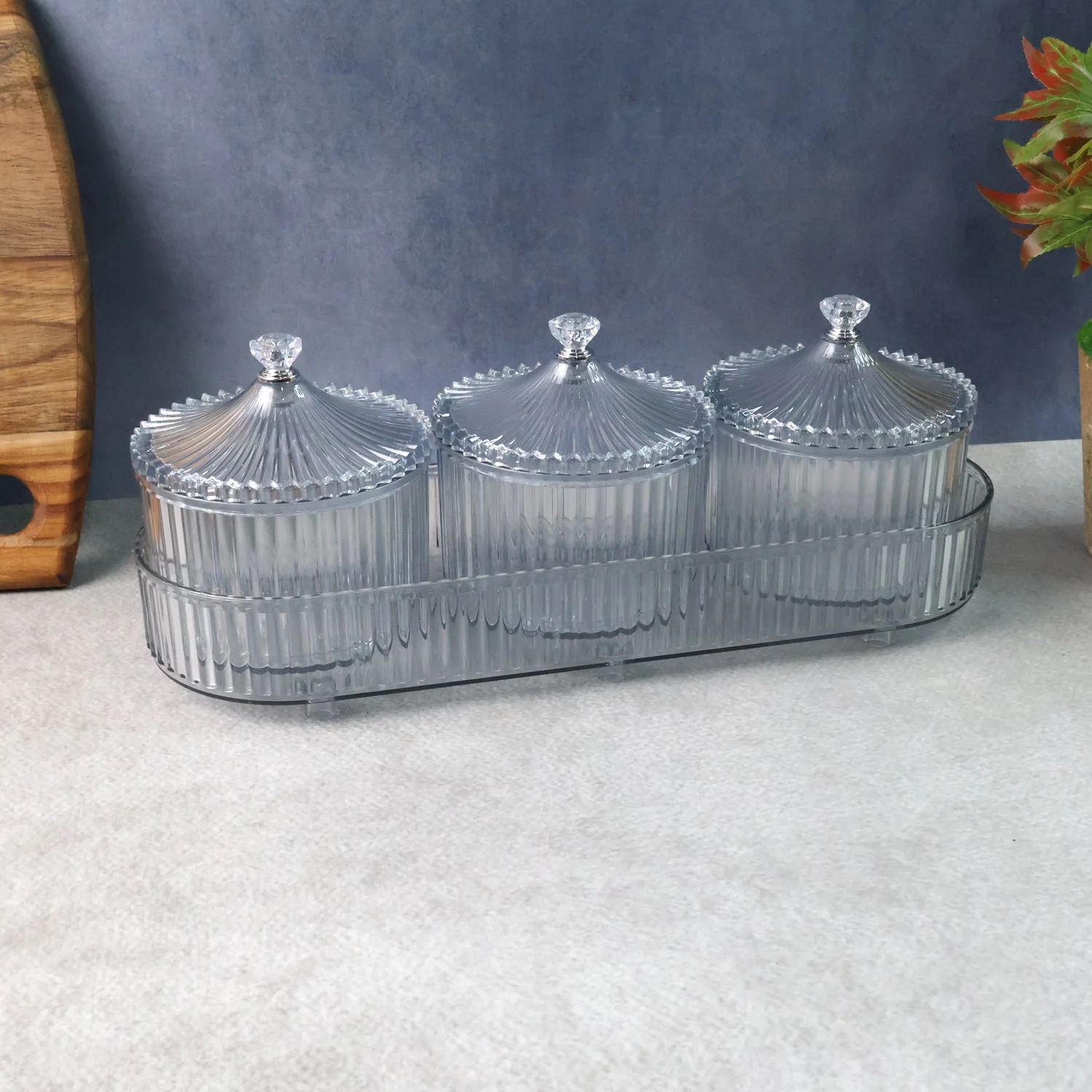 3-Jar Dry Fruit & Snack Storage Set with Tray – Transparent Ribbed Canisters with Lift Lids for Dry Fruits, Snacks, Mouth Fresheners & Counter Display (Elegant Serving/Storage Combo)