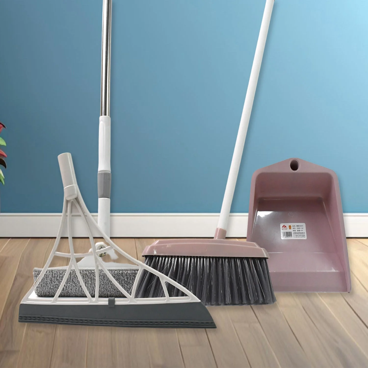 Heavy Duty Dustpan, Plastic Kitchen Wiper, 2 in 1 Adjustable Window Cleaning Squeegee Tool and Long Handle Broom Brush Combo (4 Pcs Combo)
