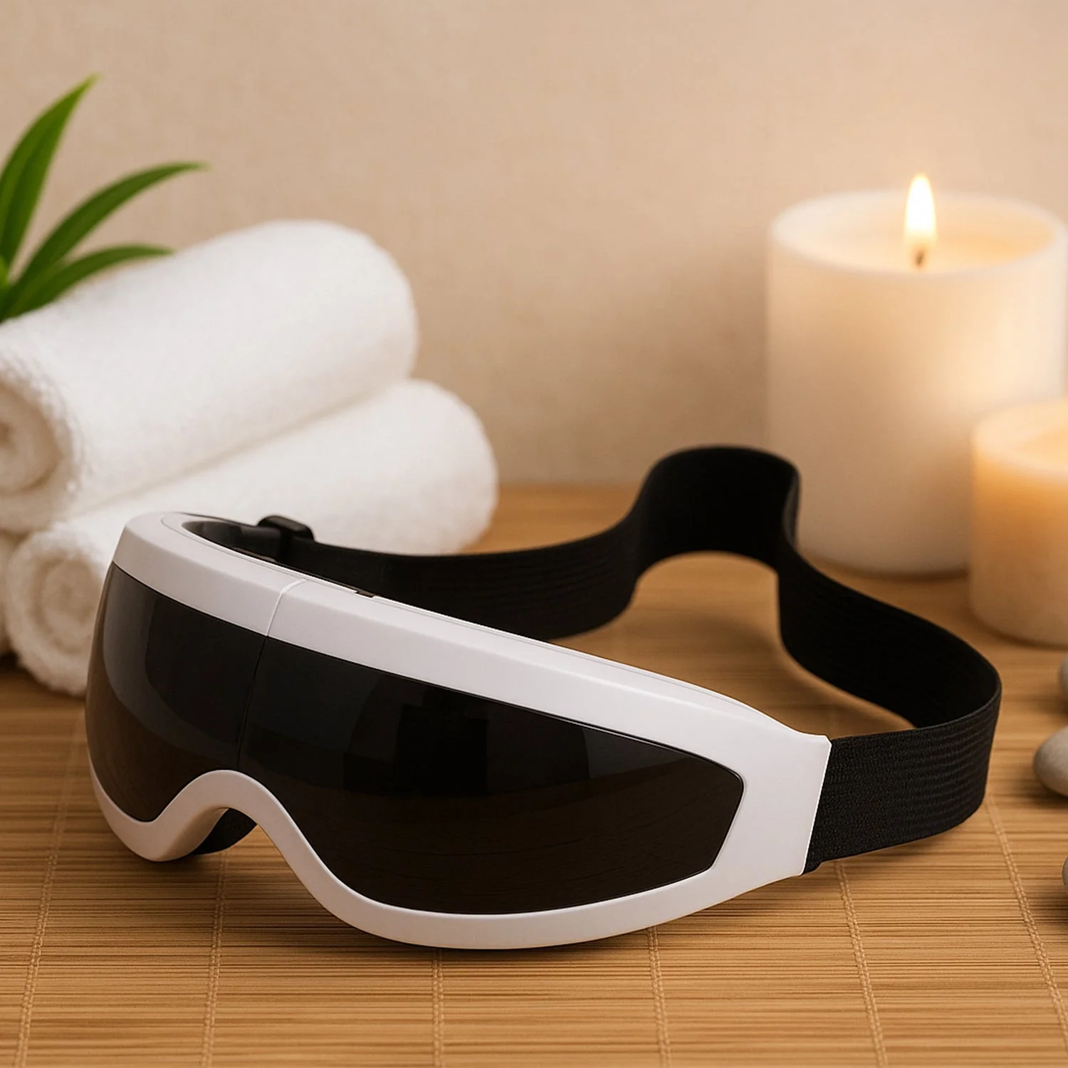 Eye massager, air pressure eye massager, hot compression eye massager, electric eye massager, rechargeable eye massager, foldable eye massager, adjustable band eye massager, stress relief eye massager, sleep improvement eye massager, eye relaxation device, eye care massager